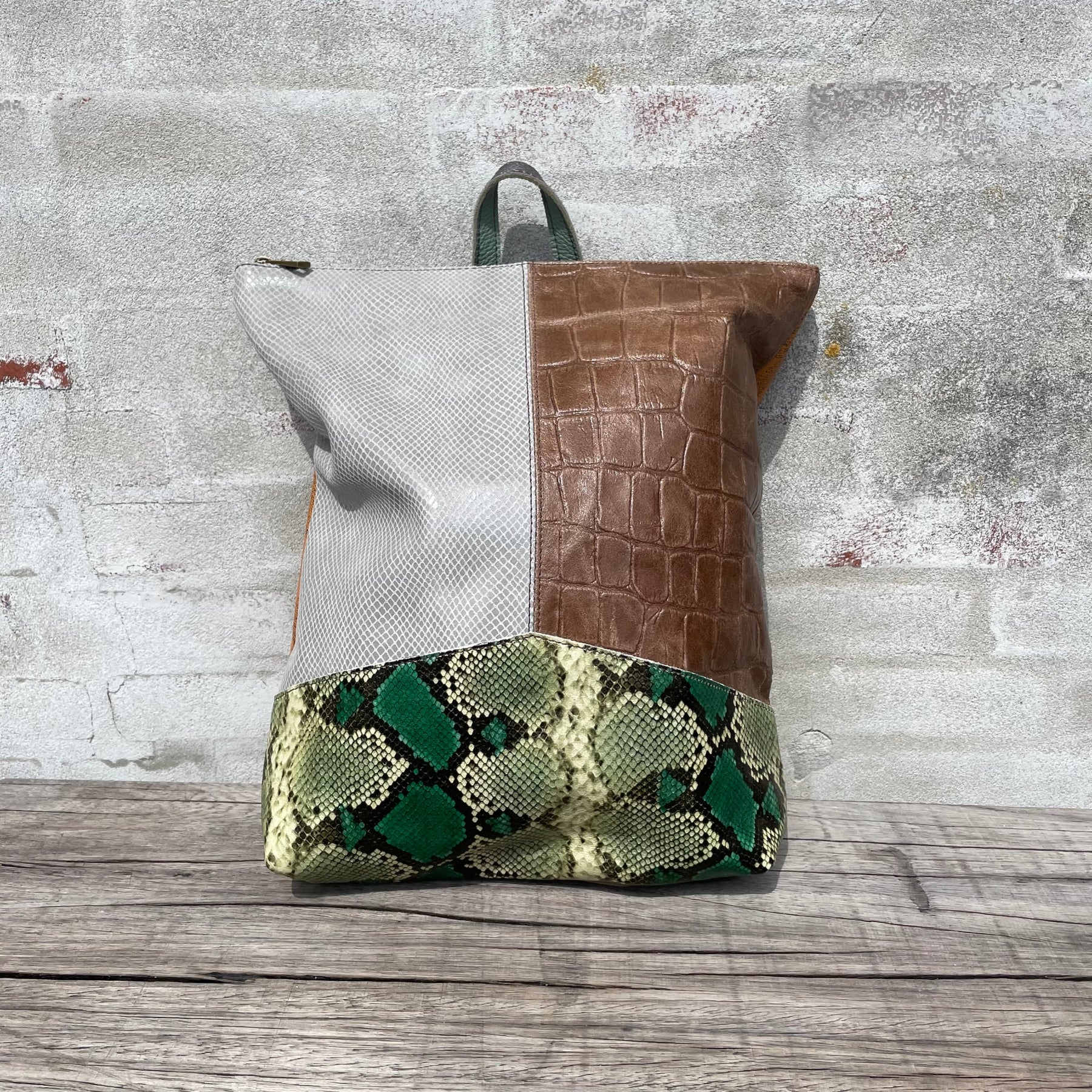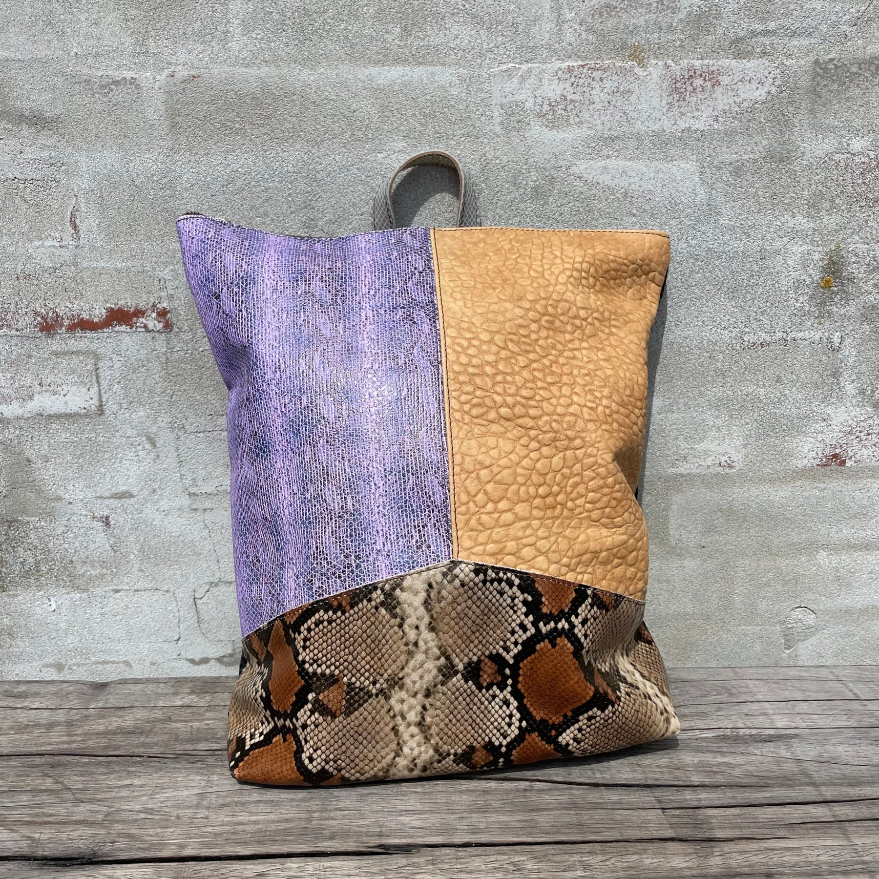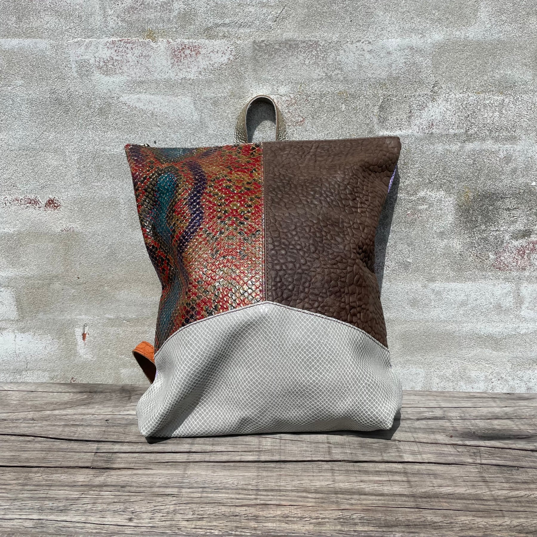 Fed rygsækstaske i forskelligt imiteret læderprint. Har to indvendige lommer. Den ene med lynlås. Indvendigt beklædt med ternet bomuld. Stropperne kan let justeres.