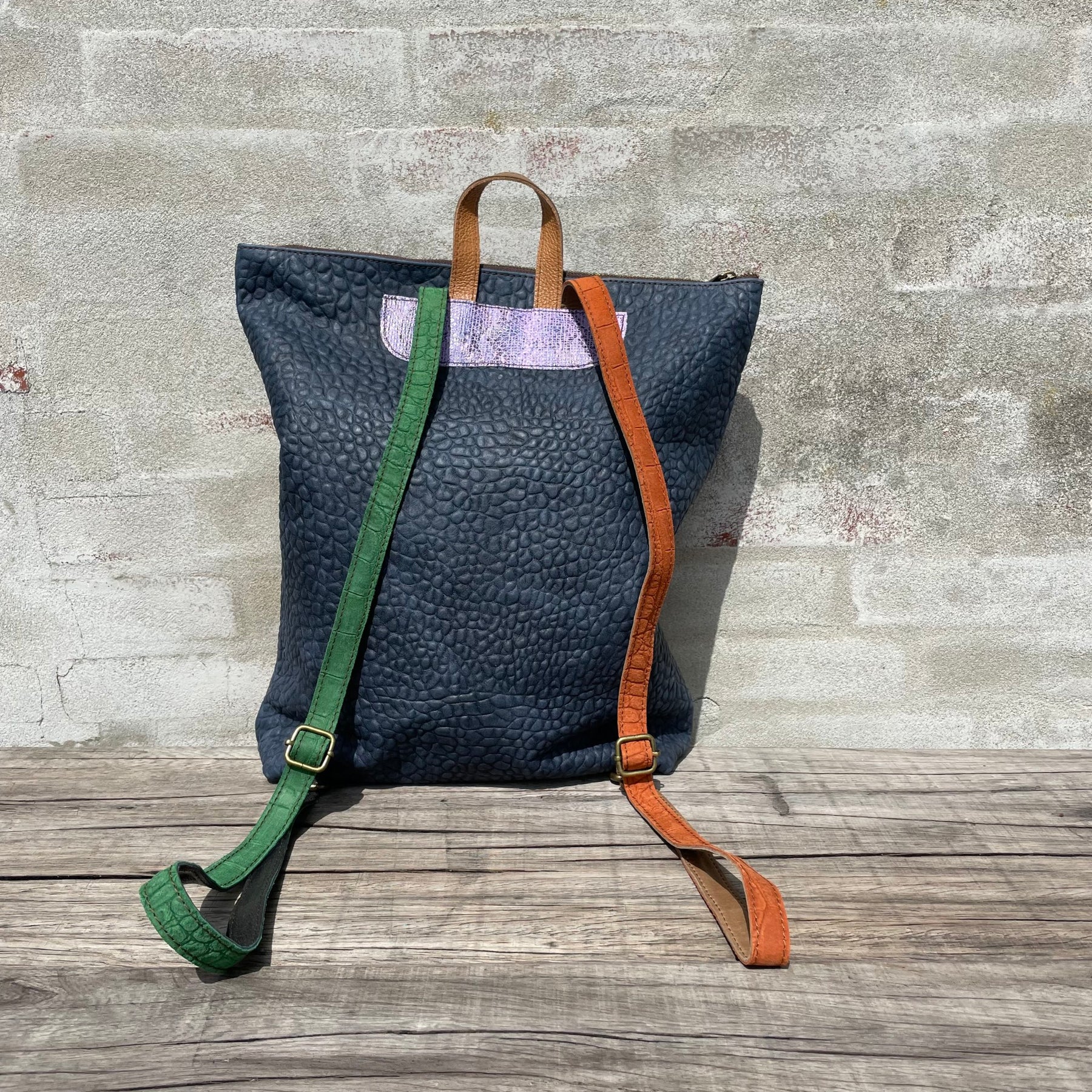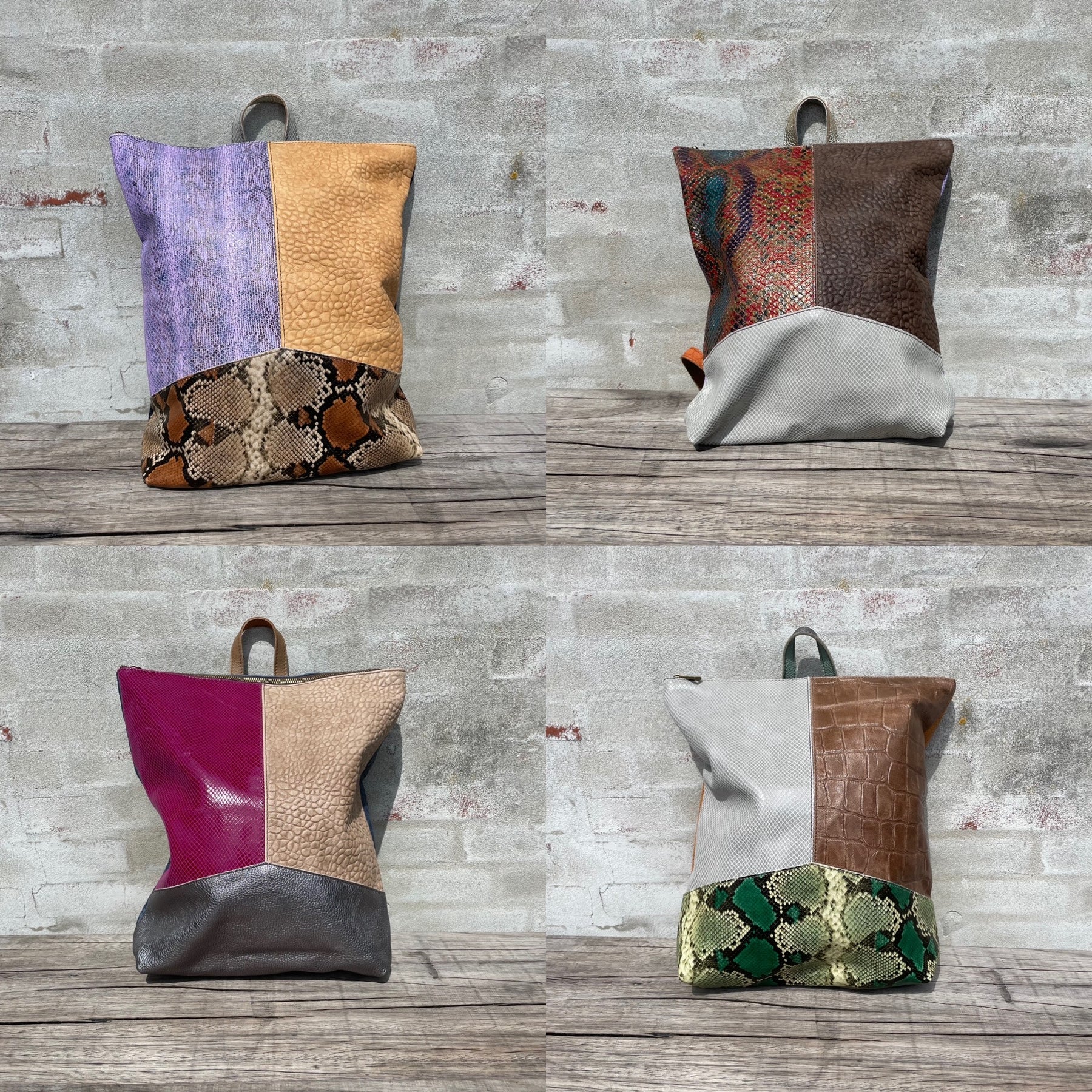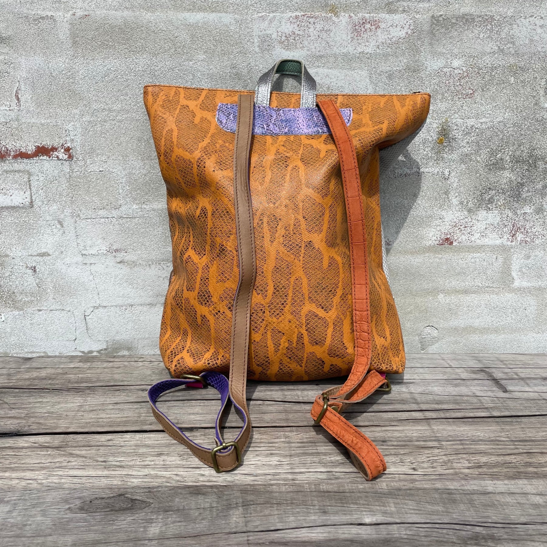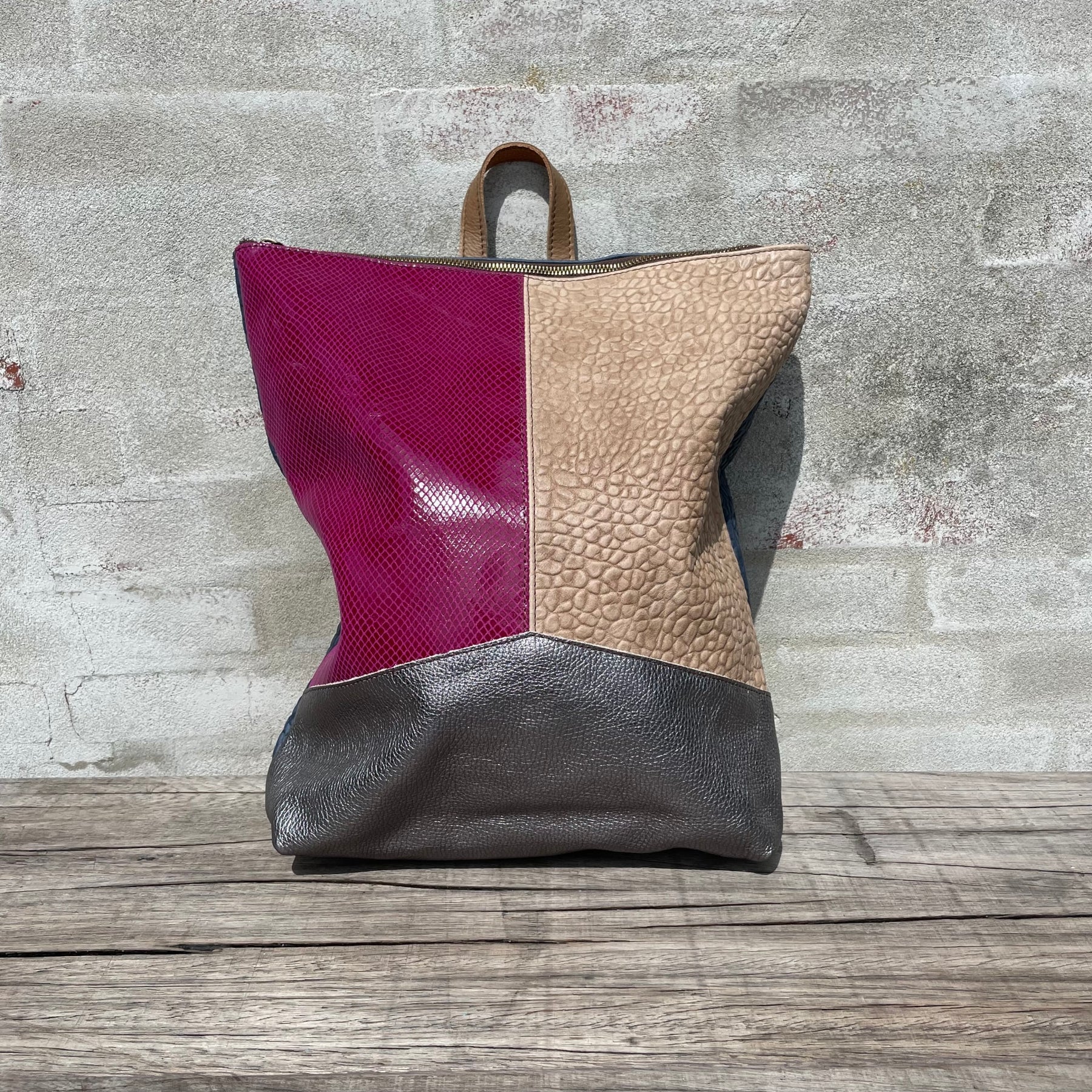 Fed rygsækstaske i forskelligt imiteret læderprint. Har to indvendige lommer. Den ene med lynlås. Indvendigt beklædt med ternet bomuld. Stropperne kan let justeres.