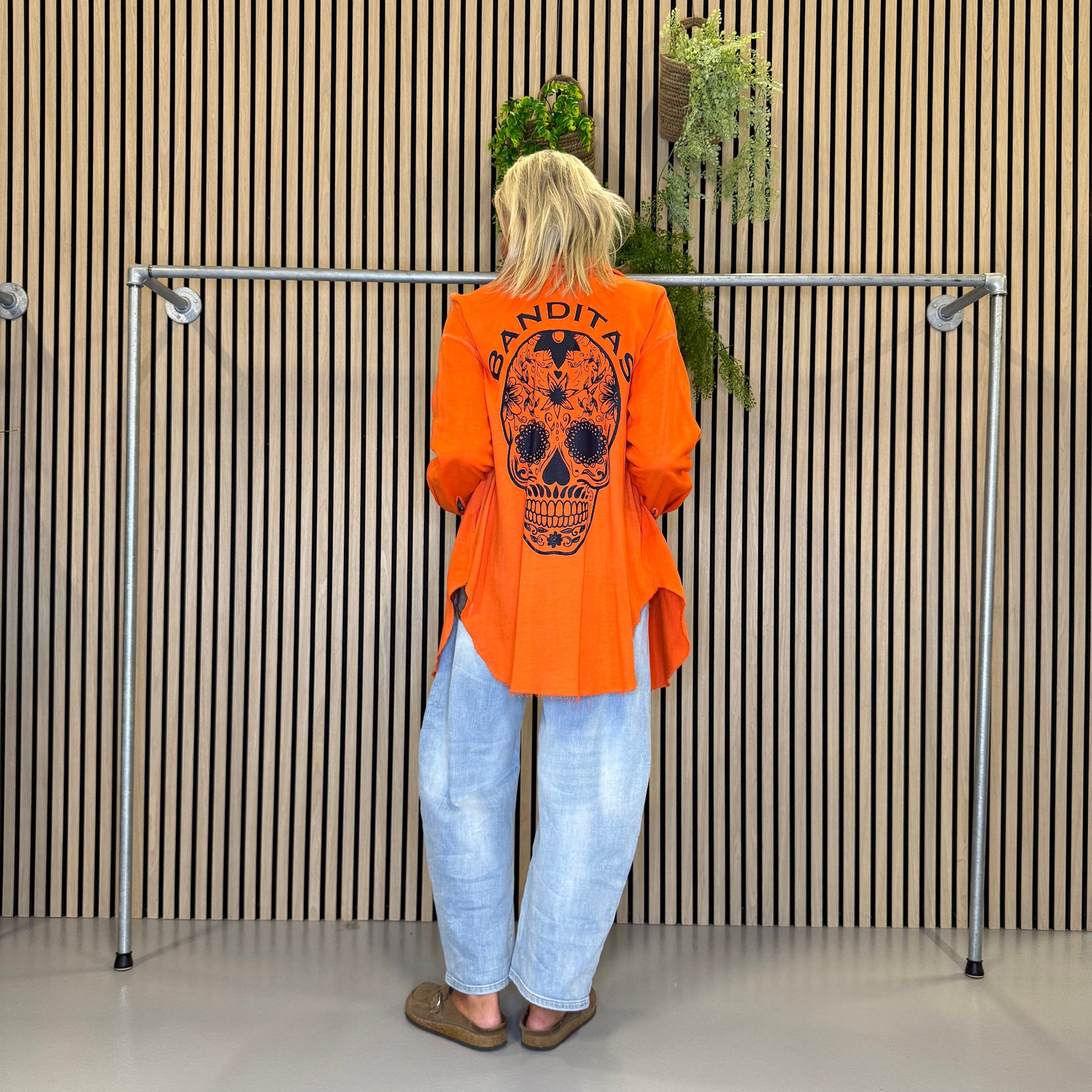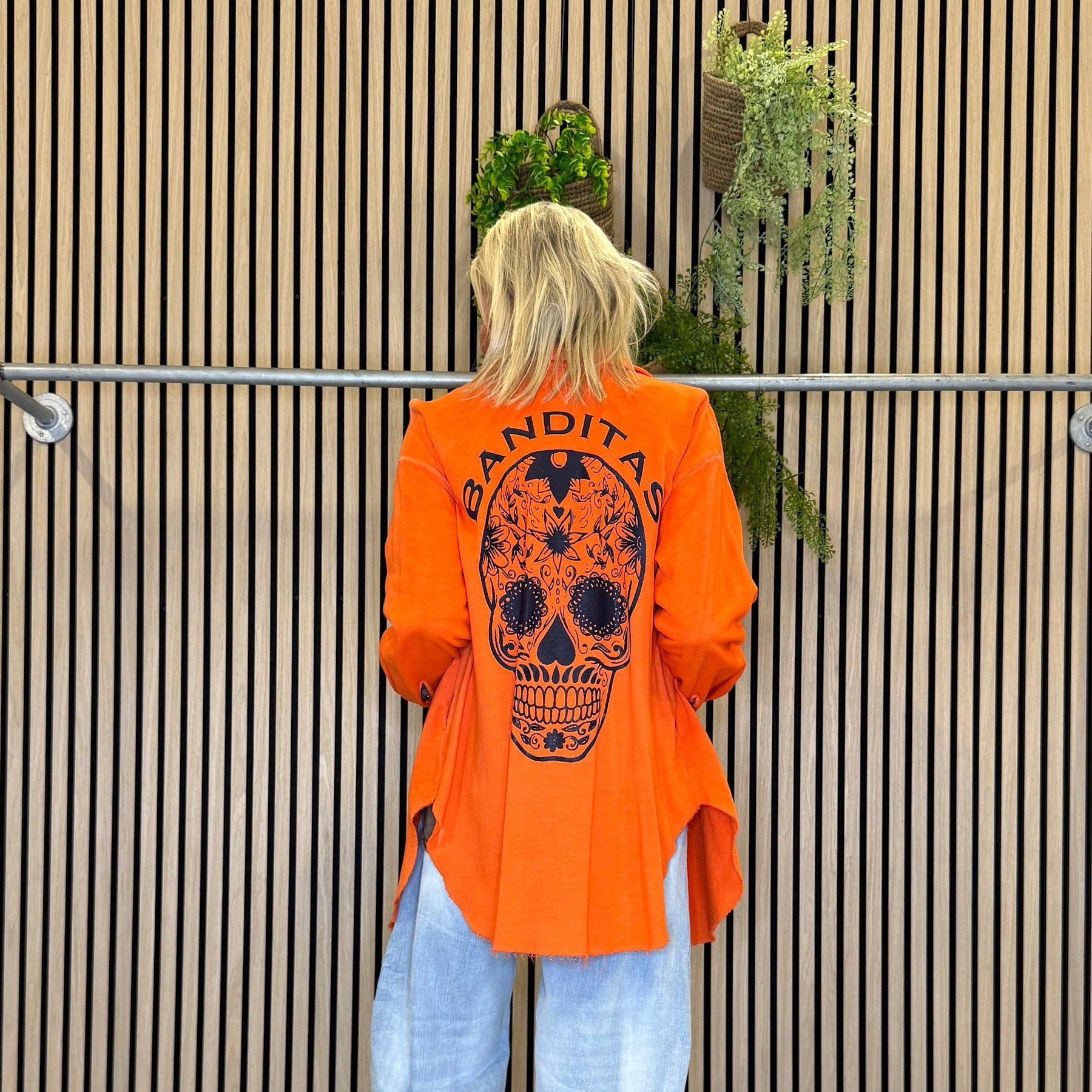 Colorfull shirt with big buttons, collar and pink squll at the back.