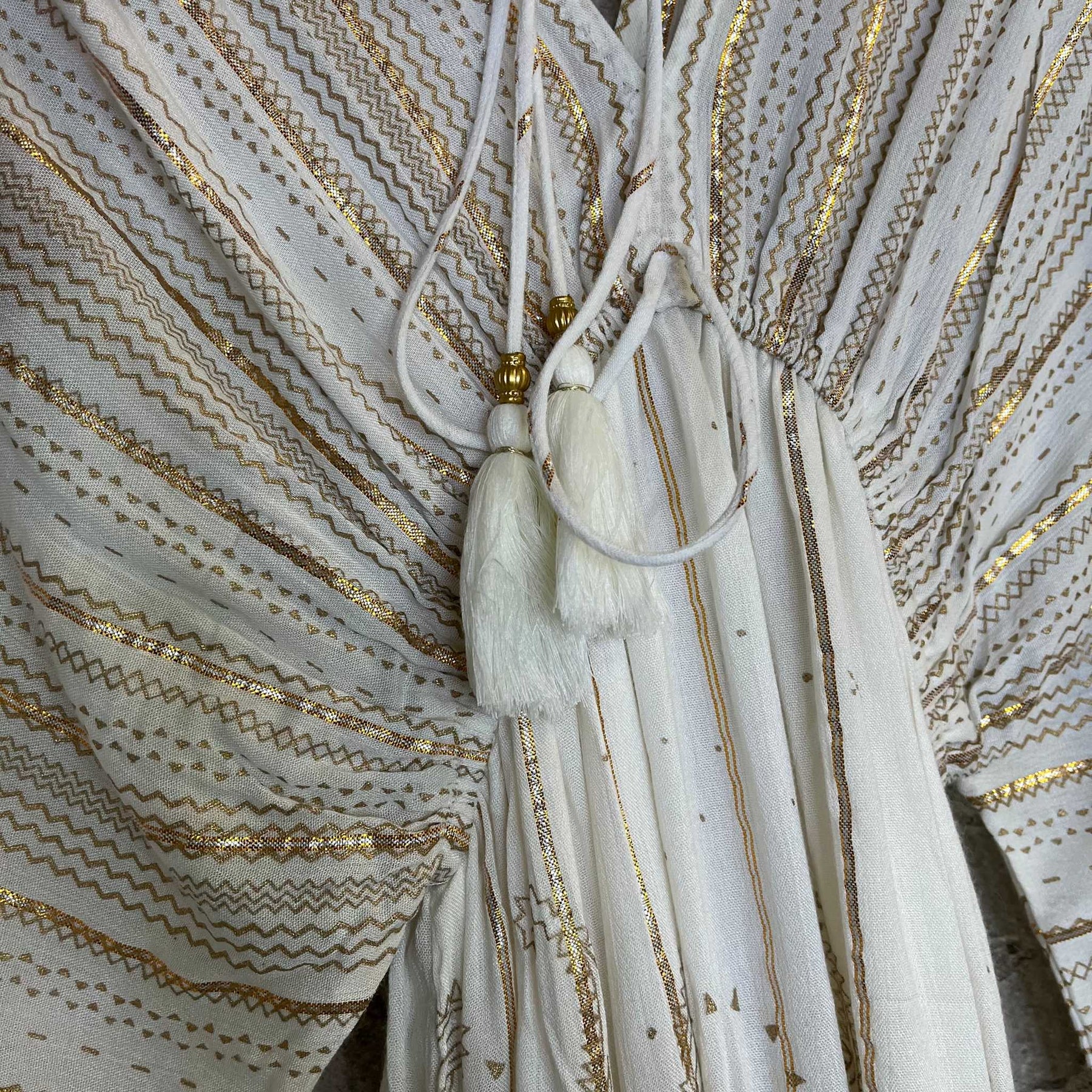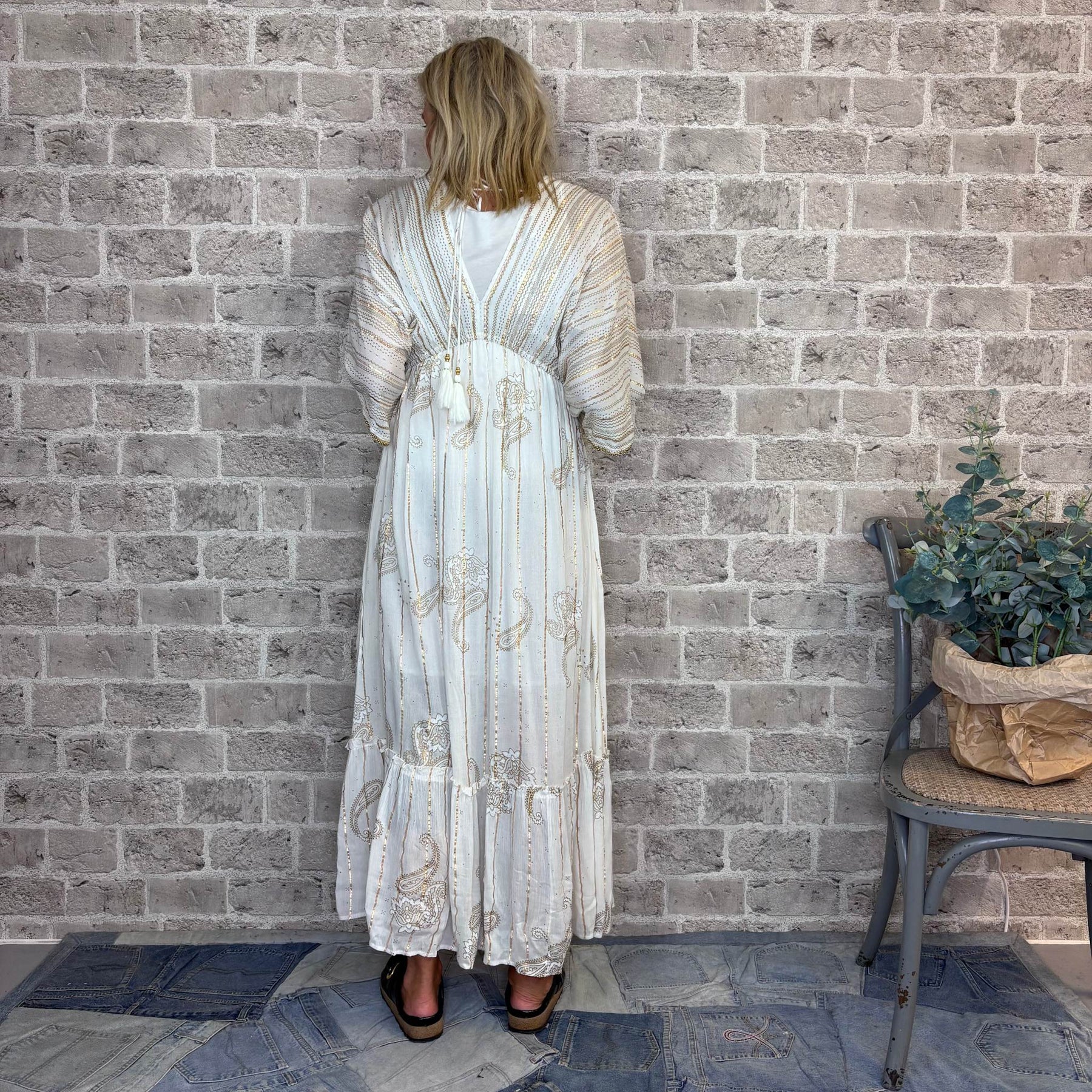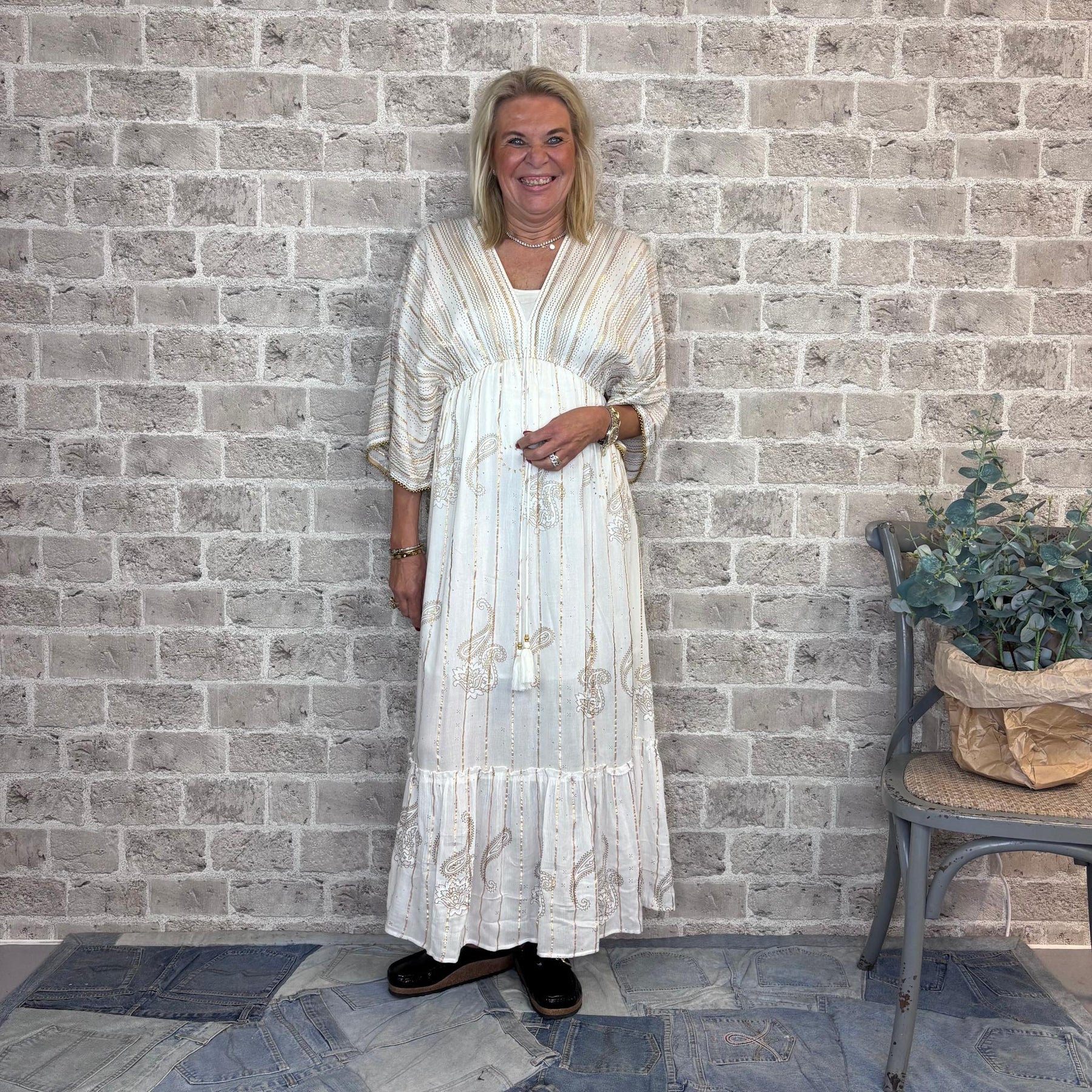 Super flot lang kjole med guld stoffet og perler på ærmer.