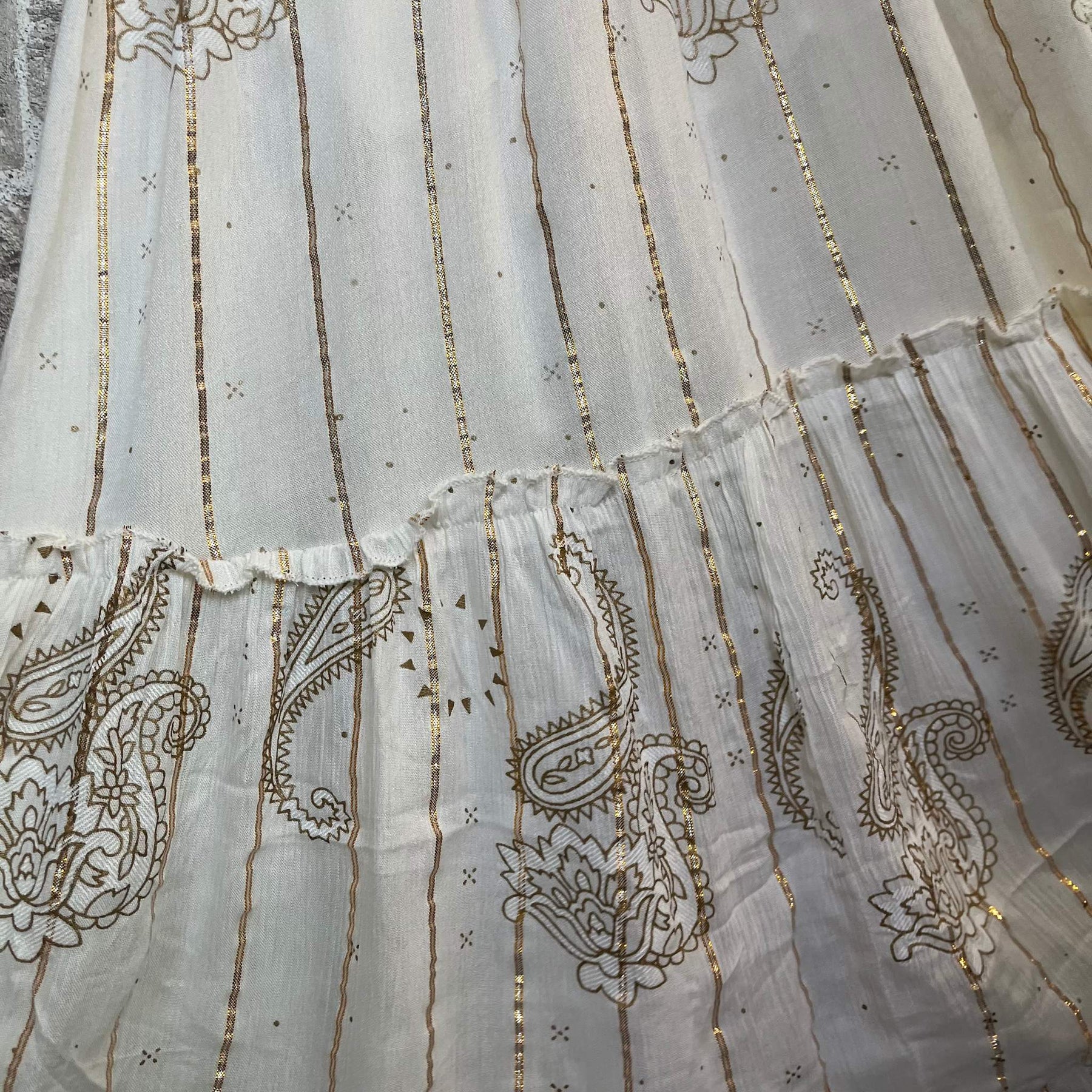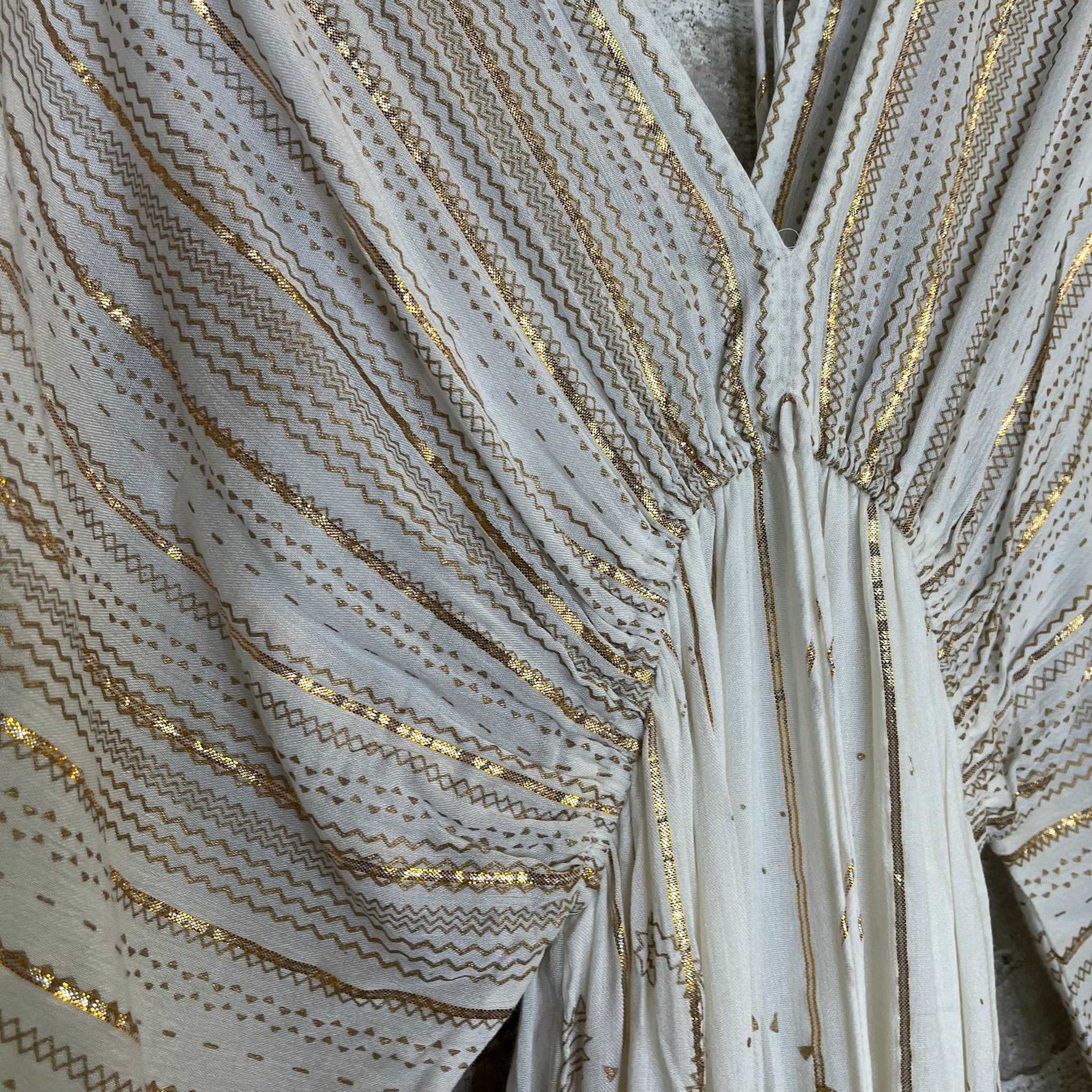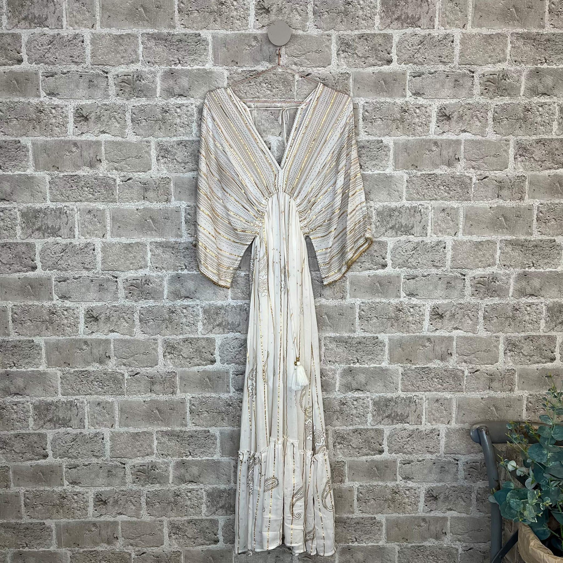 Super flot lang kjole med guld stoffet og perler på ærmer.
