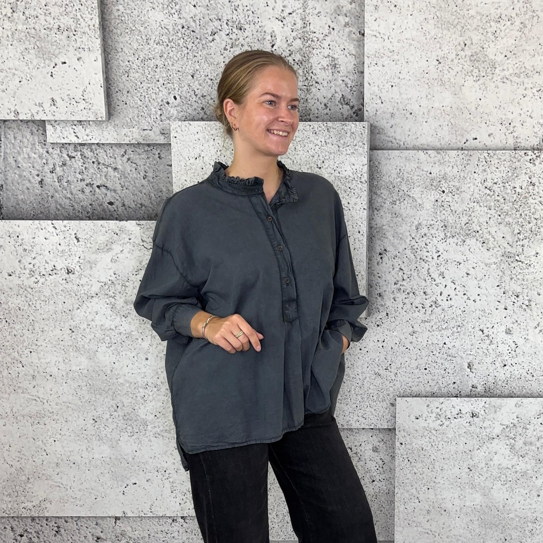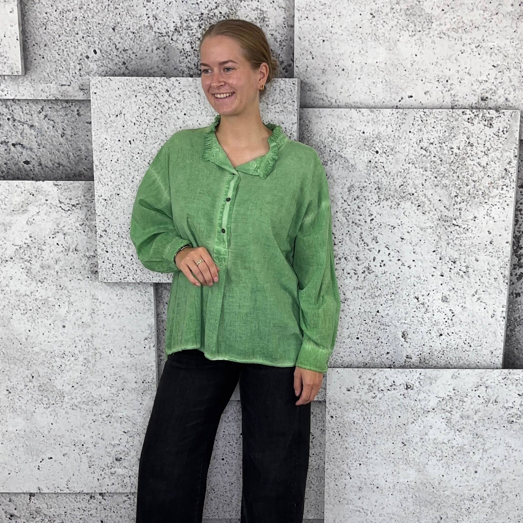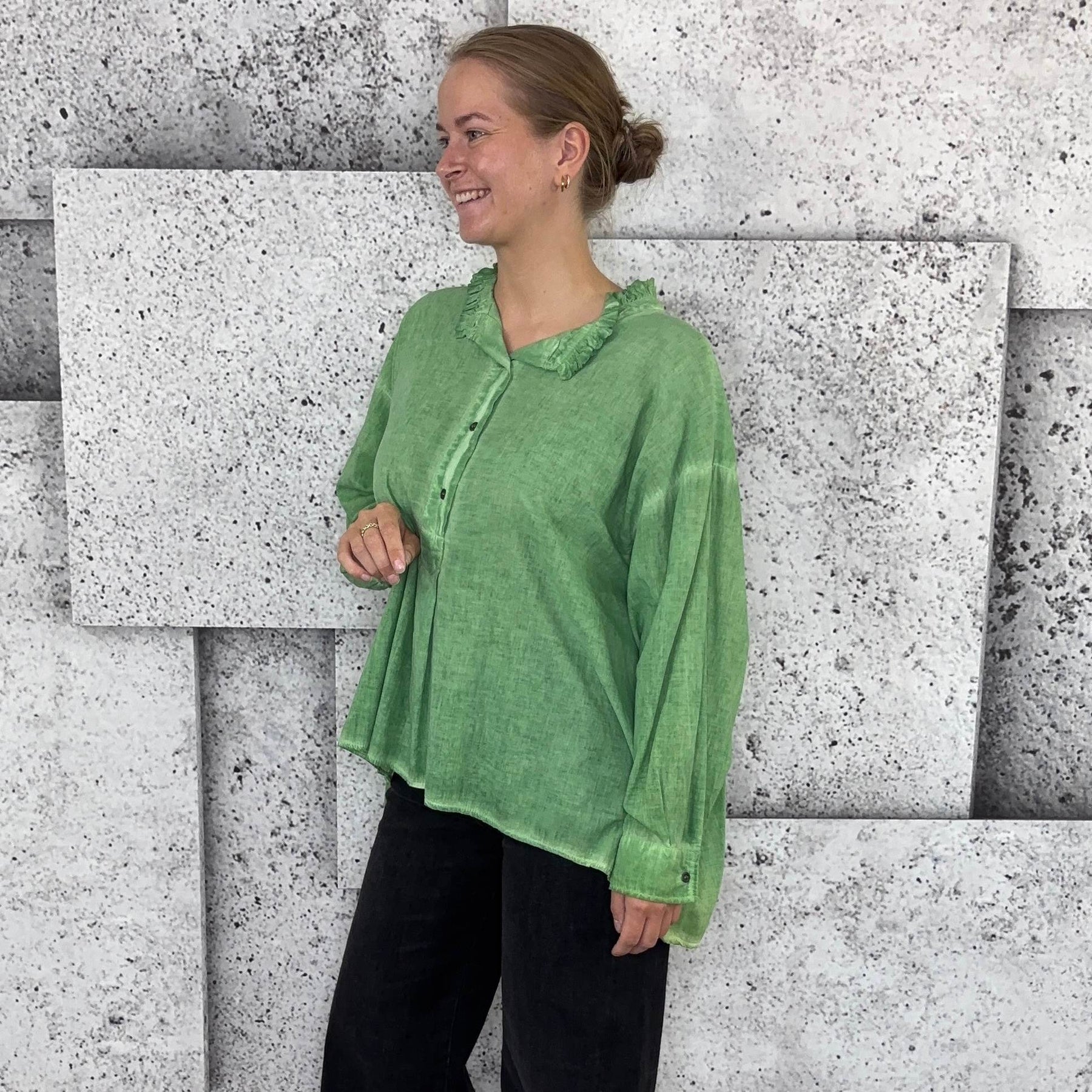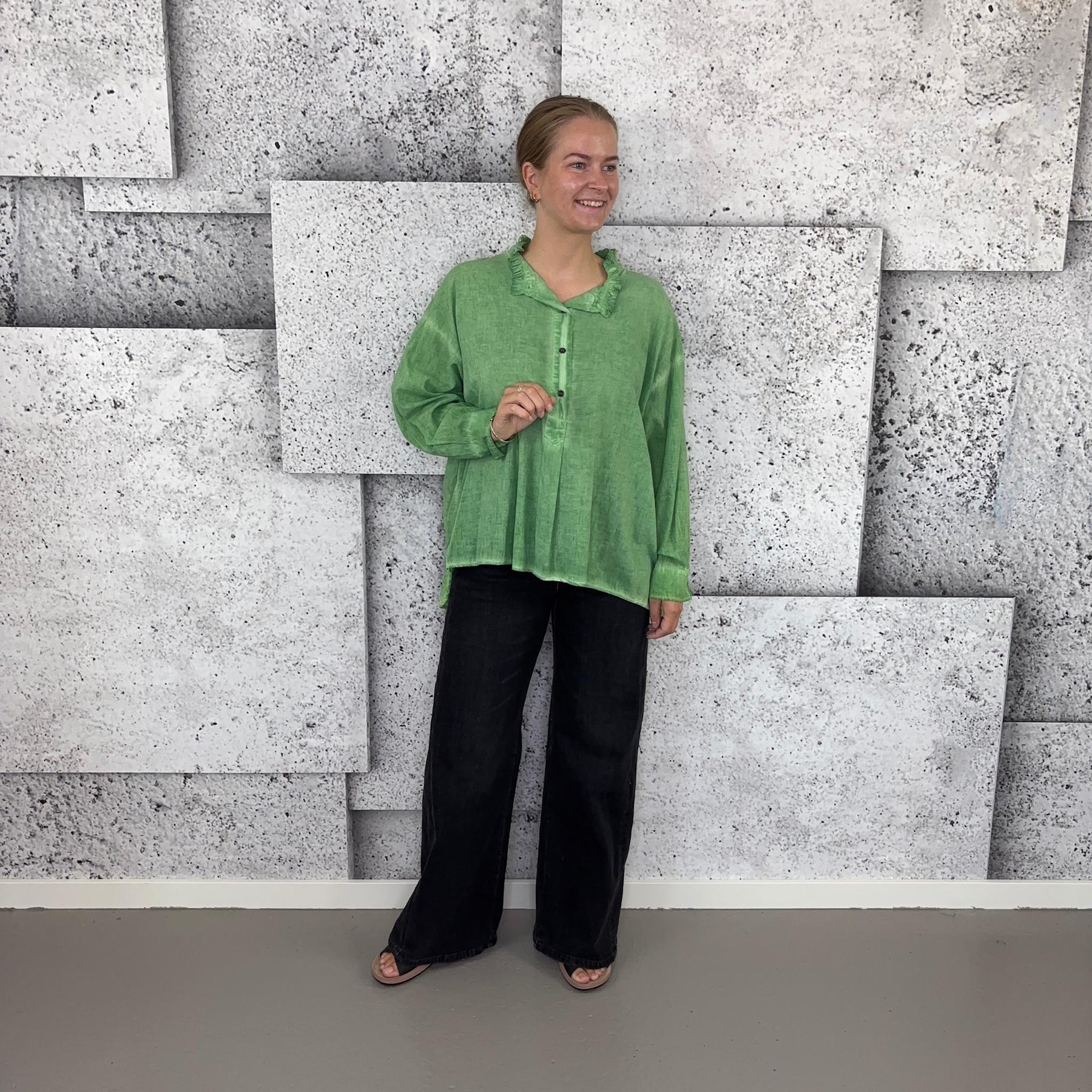 ❥ Mål på størrelse: Onesize - Mål over bryst: 76 cm - Mål i bund: 85 cm - Længde front: 68 cm - Længde Bag: 78 cm - Ærme udvendig: 74 cm - Ærme indvendig: 45 cm