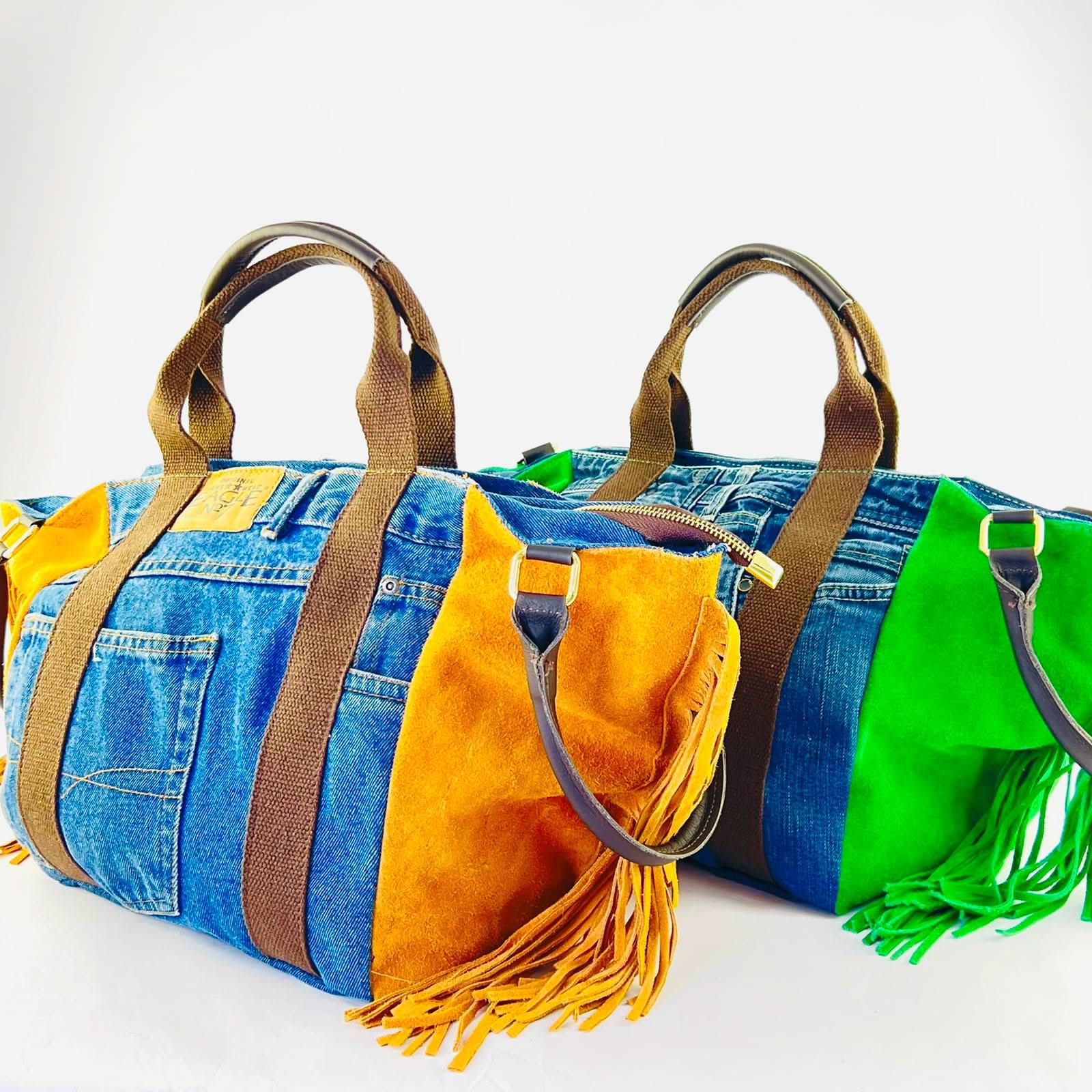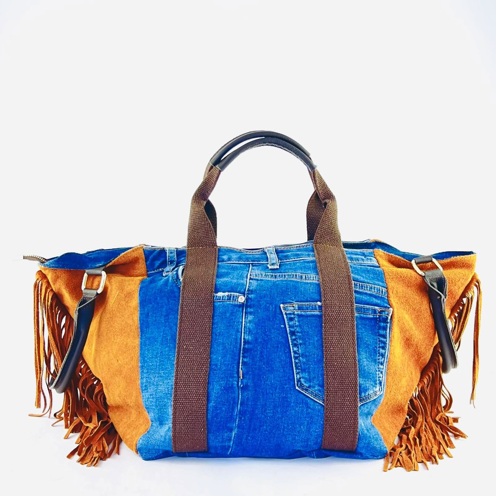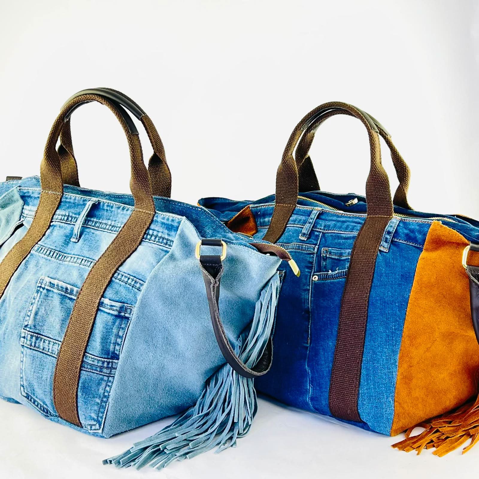 Recycle jeans weekbag Denne taske er produceret i 100% recycled materialer og derfor fremstår de hver især som unika. Denne taske er altid et sikkert valg, og sætter lidt ekstra kulør på dit outfit.