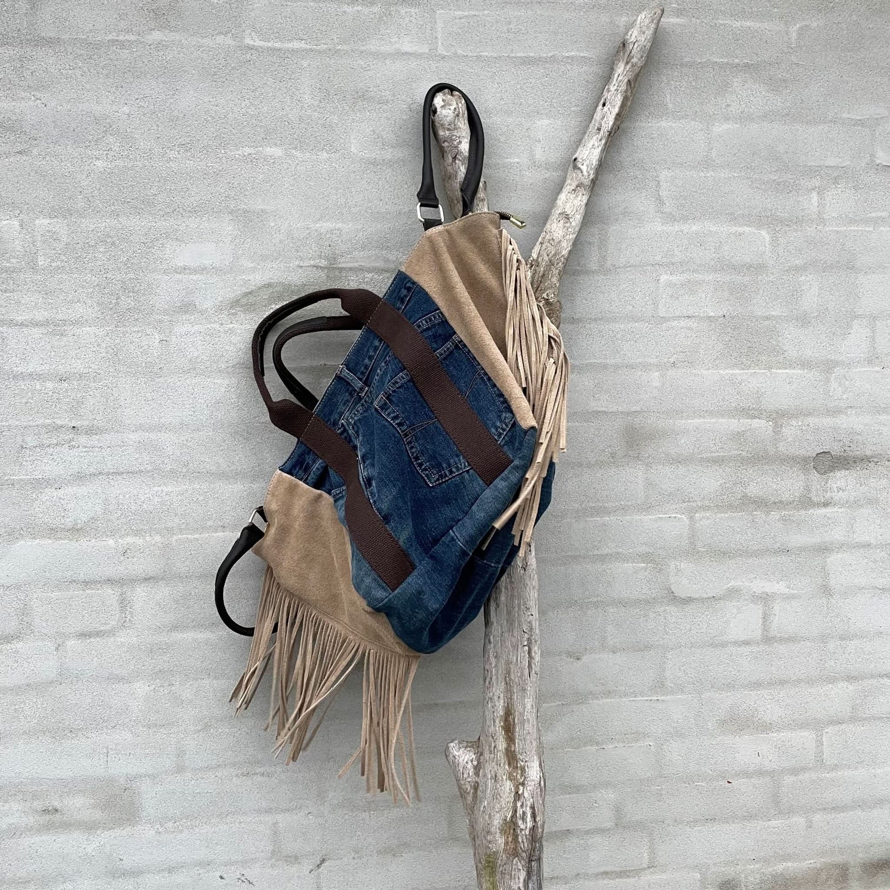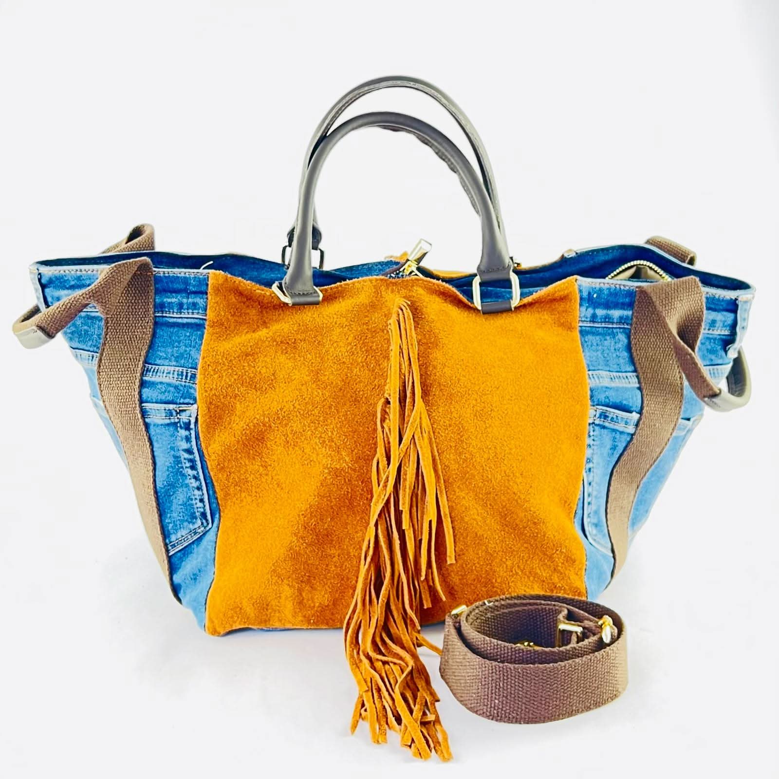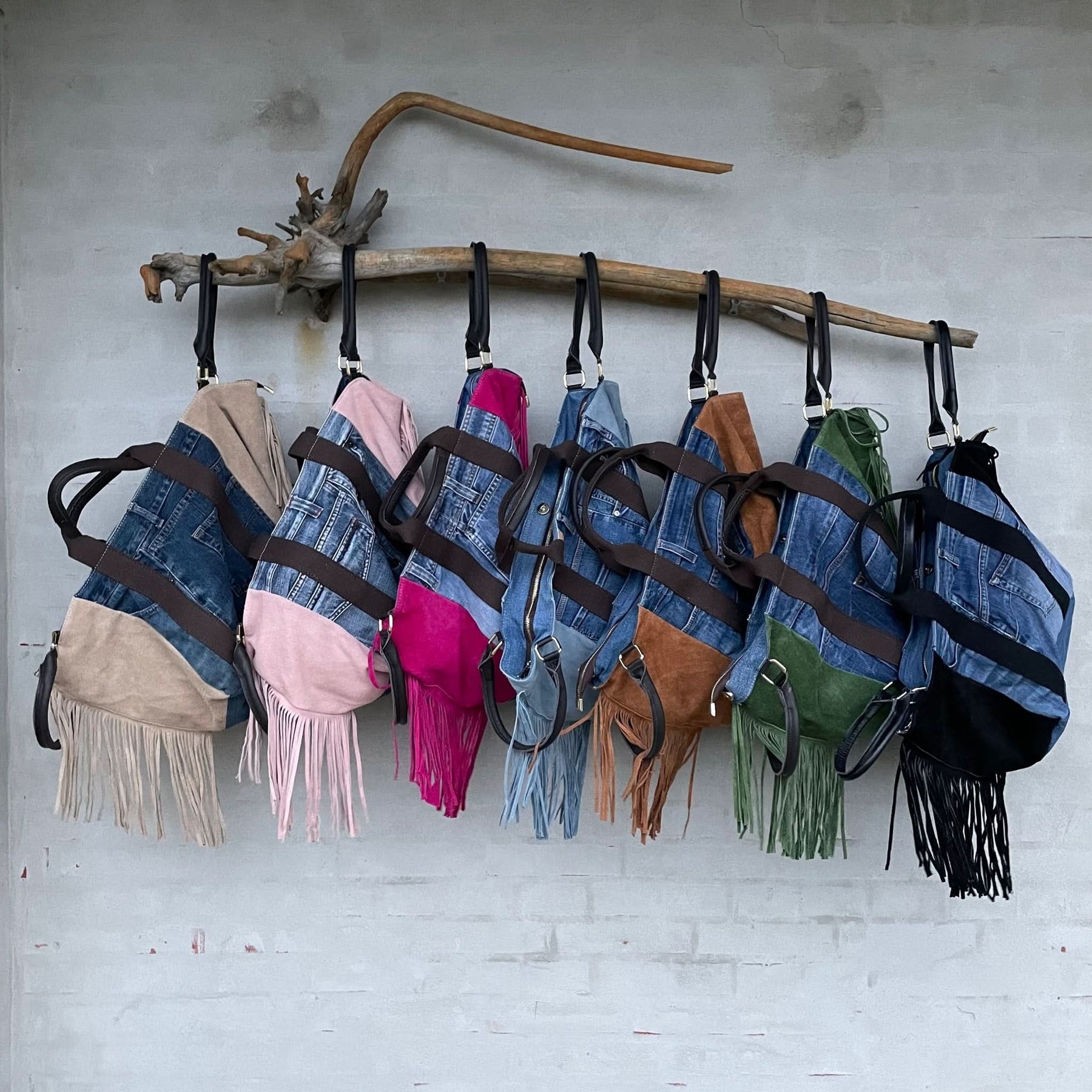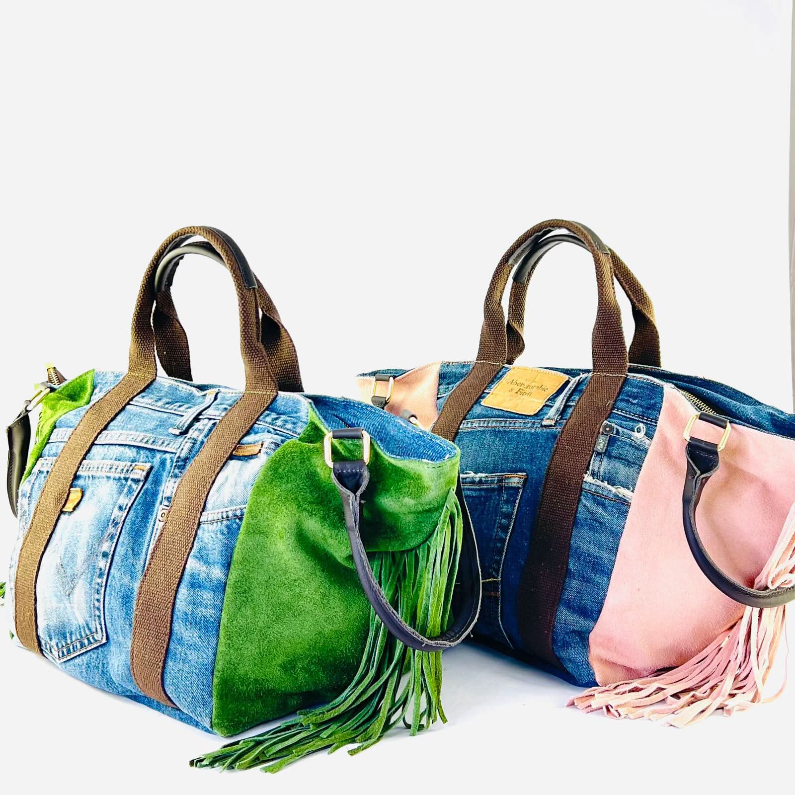 Recycle jeans weekbag Denne taske er produceret i 100% recycled materialer og derfor fremstår de hver især som unika. Denne taske er altid et sikkert valg, og sætter lidt ekstra kulør på dit outfit.