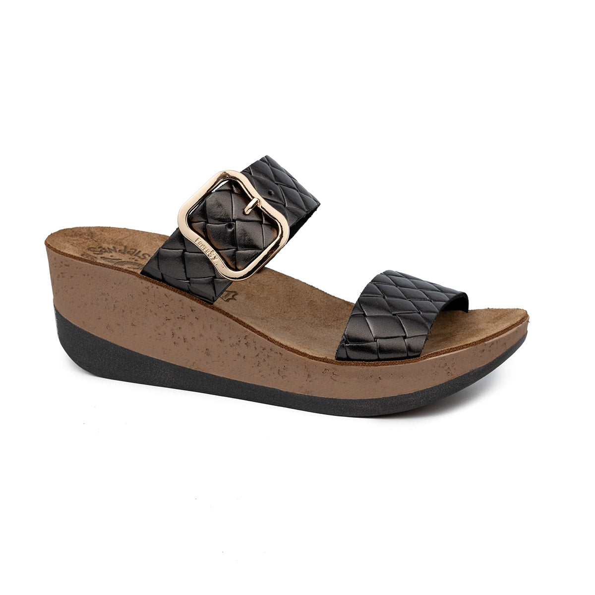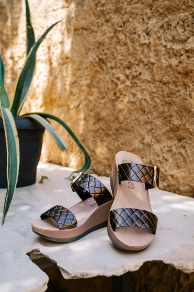 En smart sandal med kilehæl, remme samt en justerbare spænde over foden.