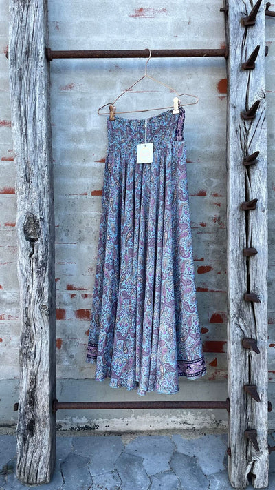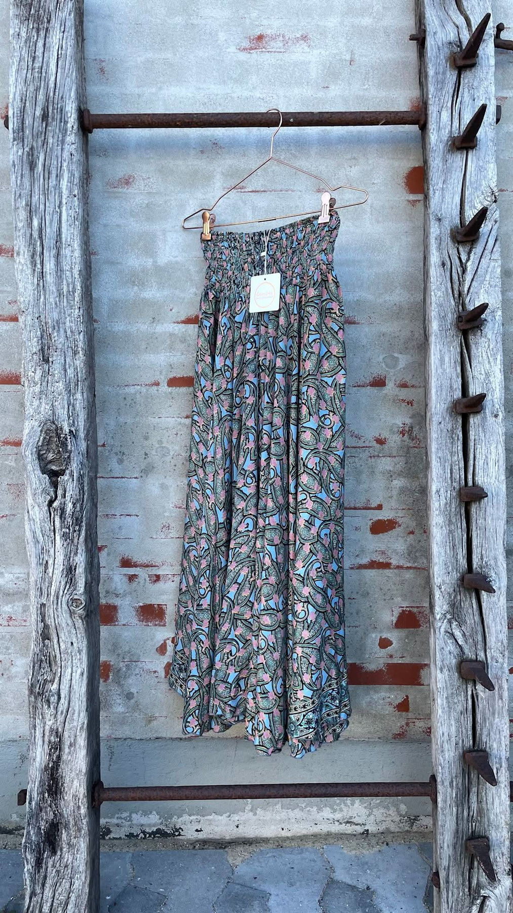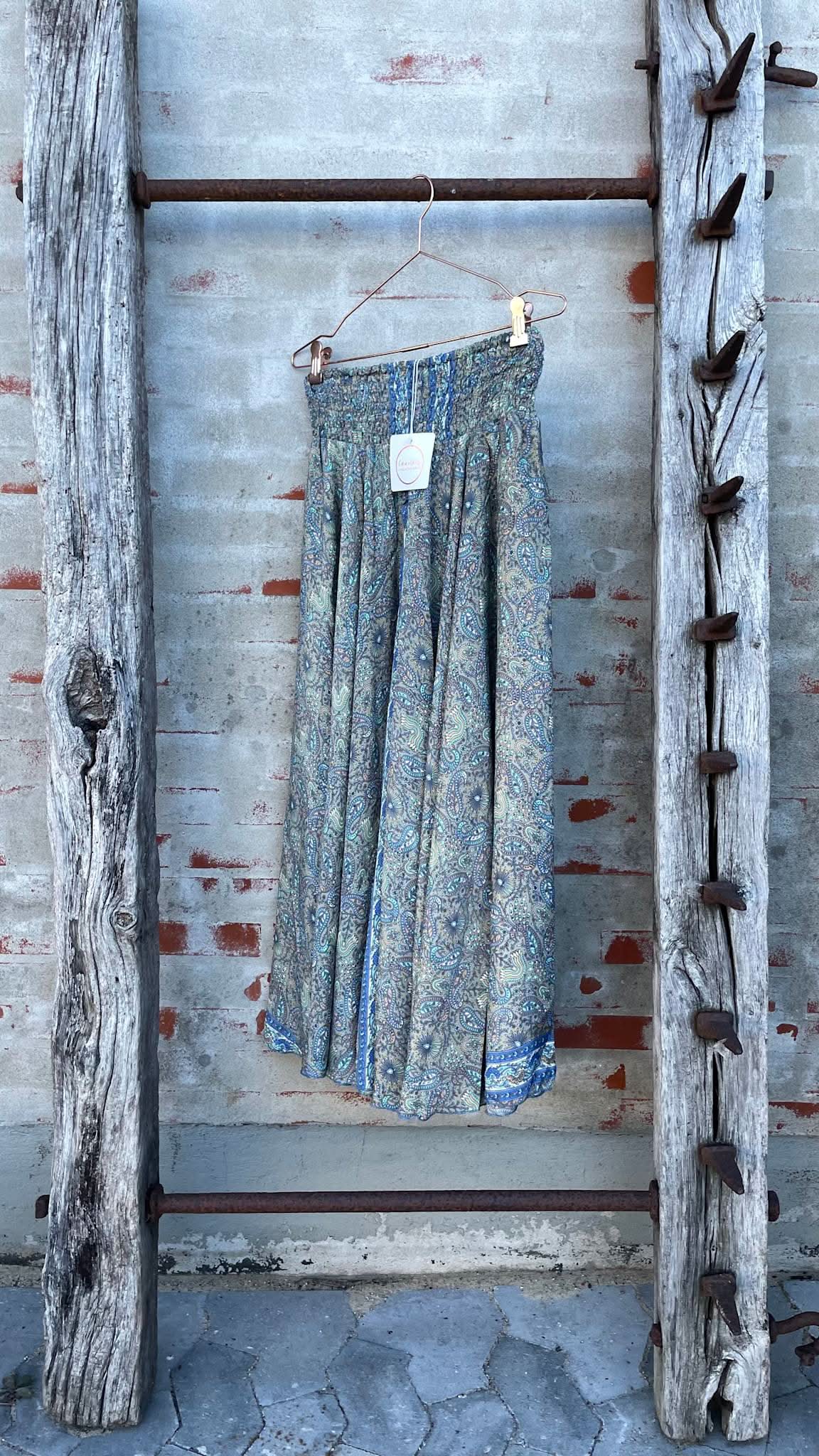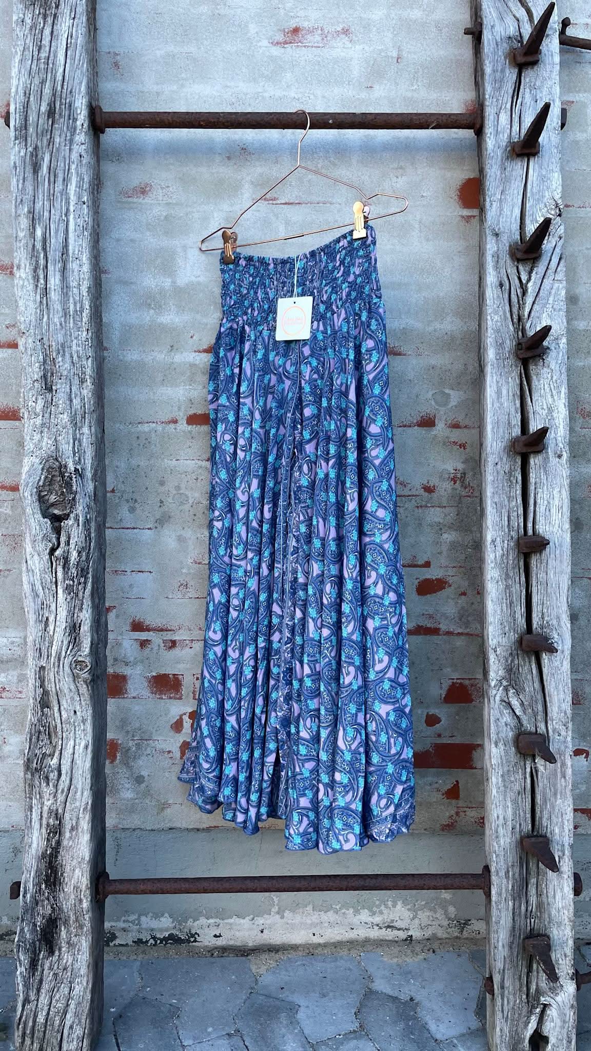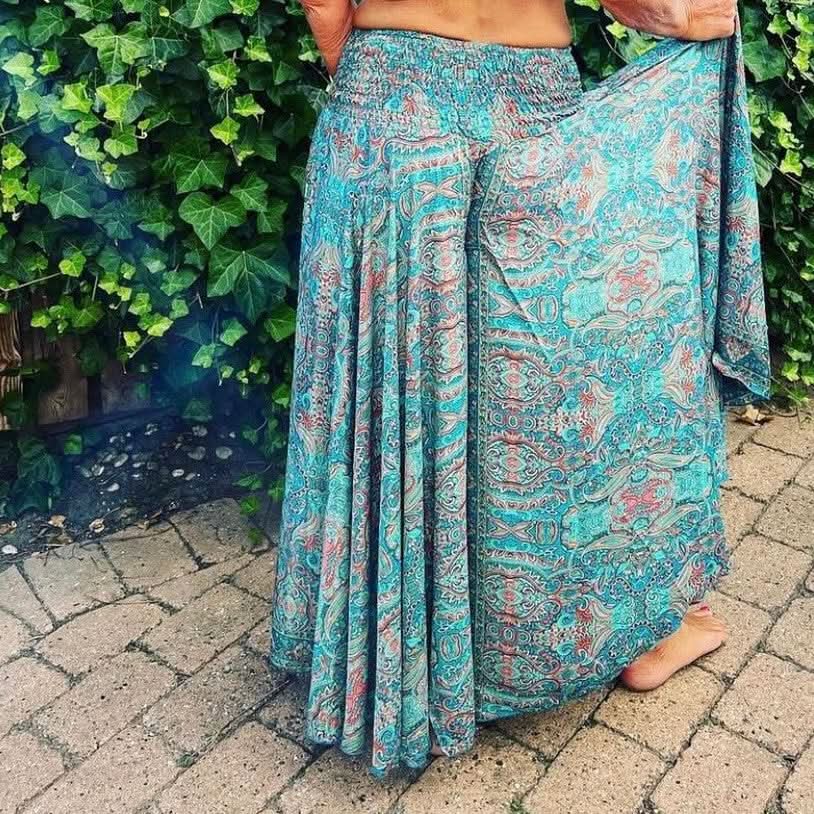 Long pants skirt in printed silk and viscose.