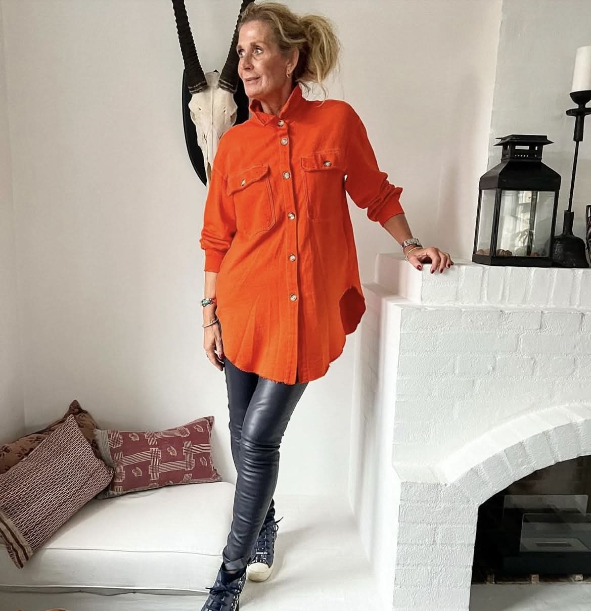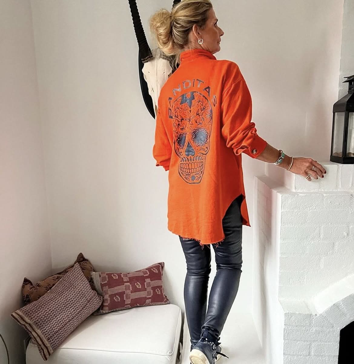 Colorfull shirt with big buttons, collar and pink squll at the back.