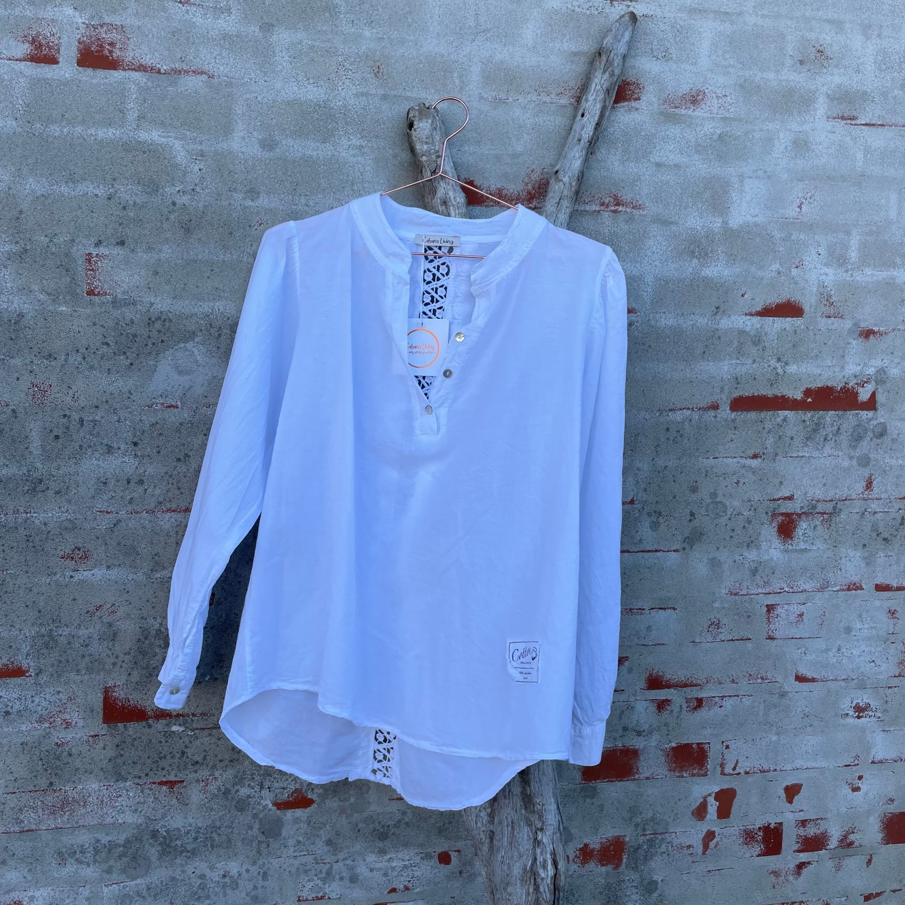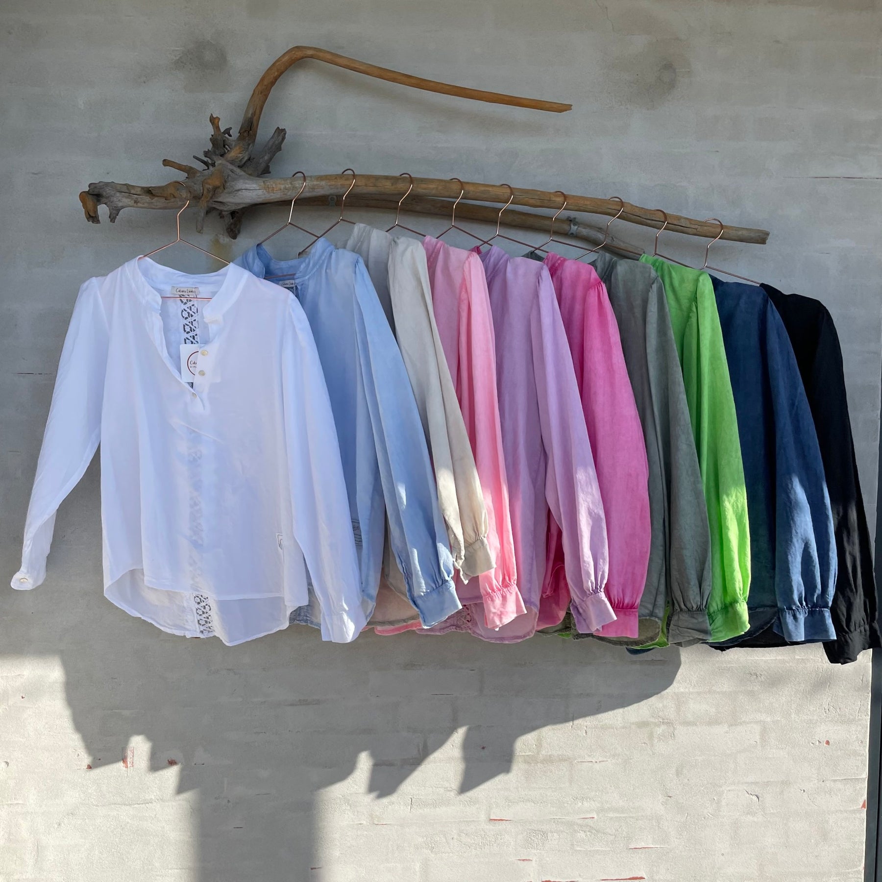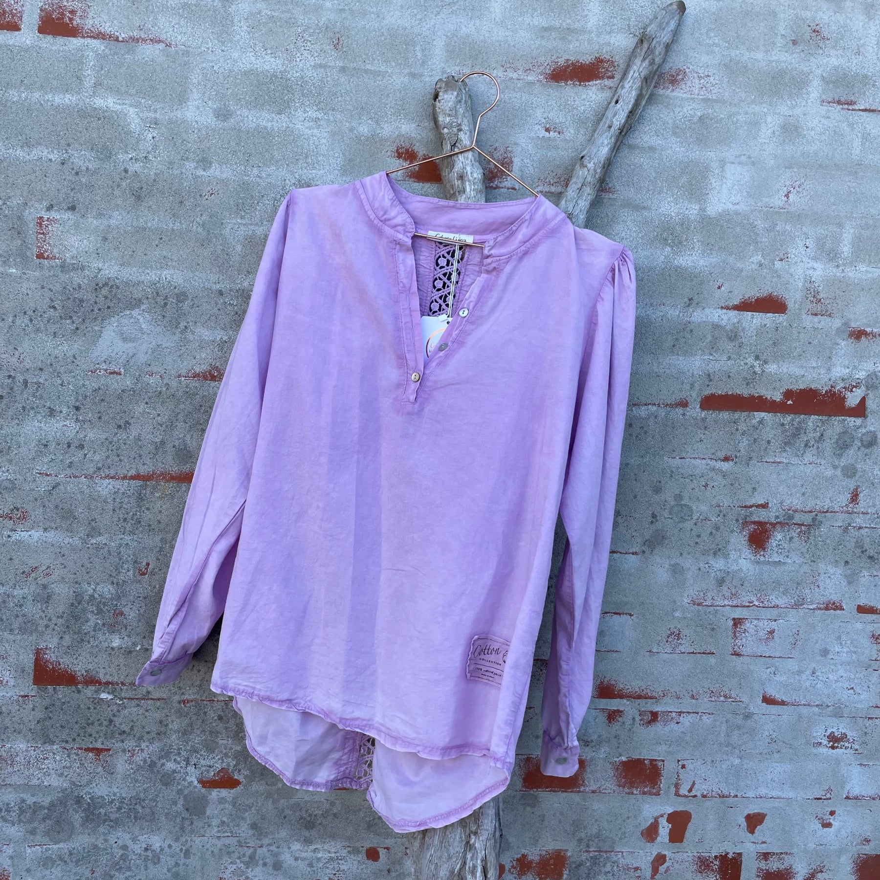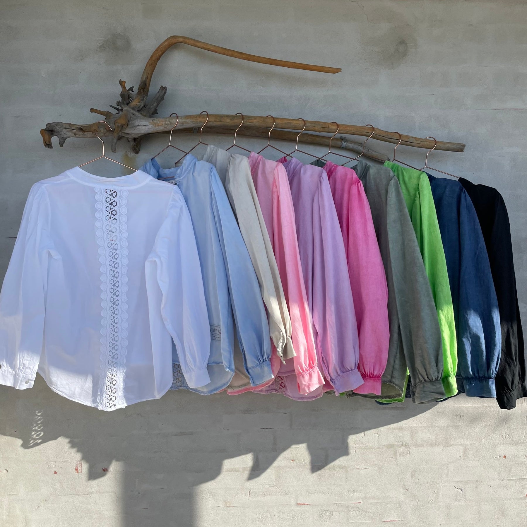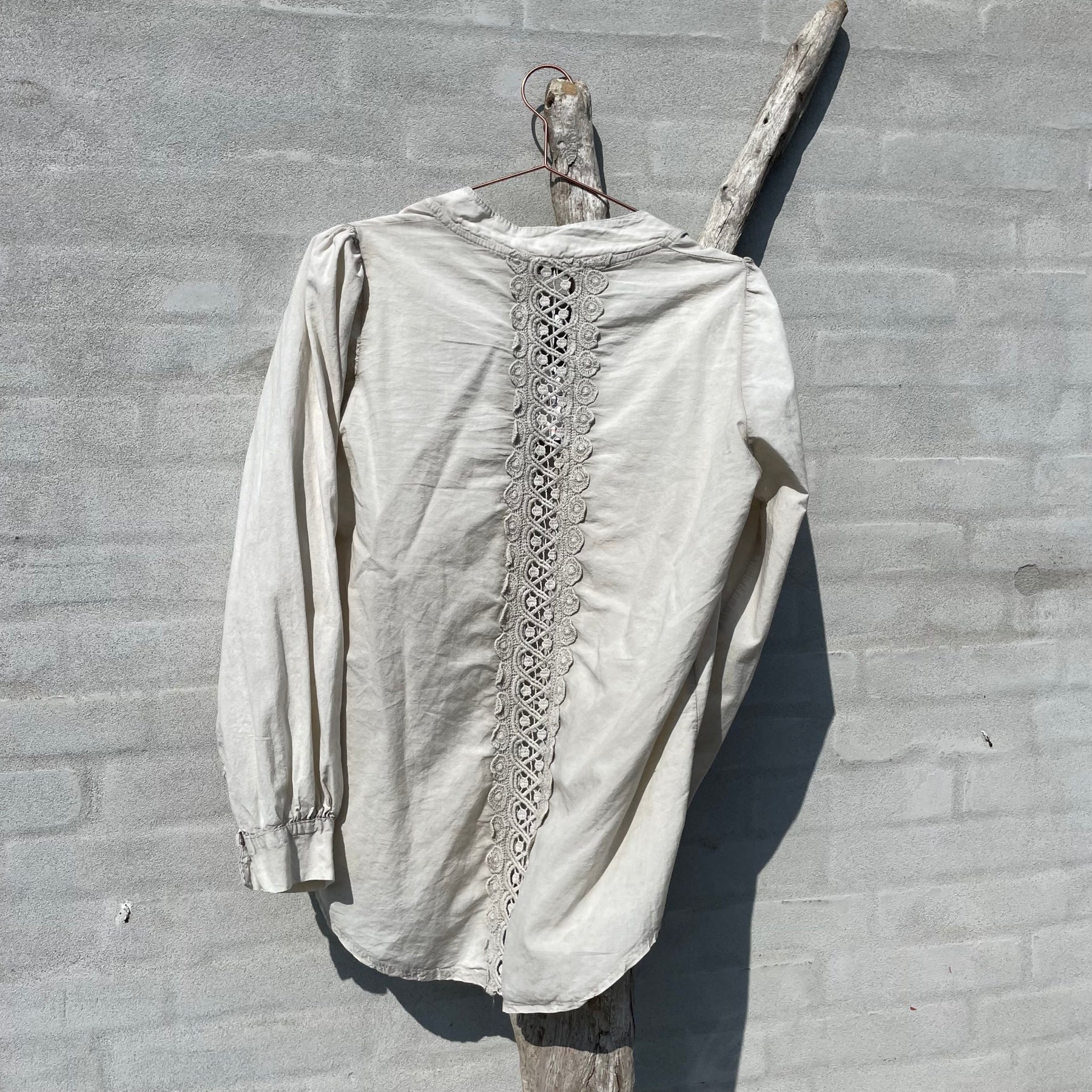 Lækker let bomuldsbluse med kinakrave og blonde indsats i ryggen.