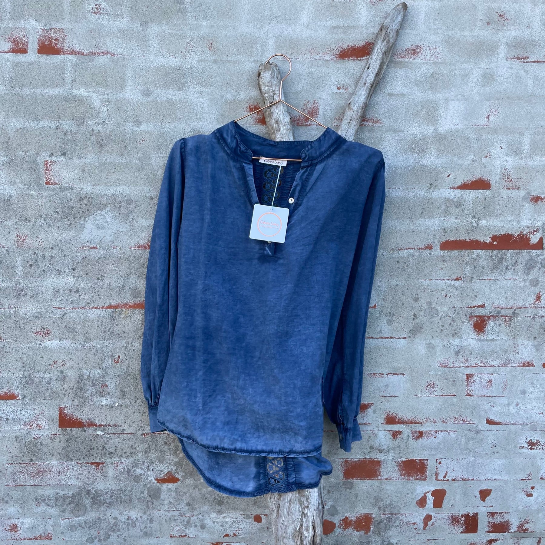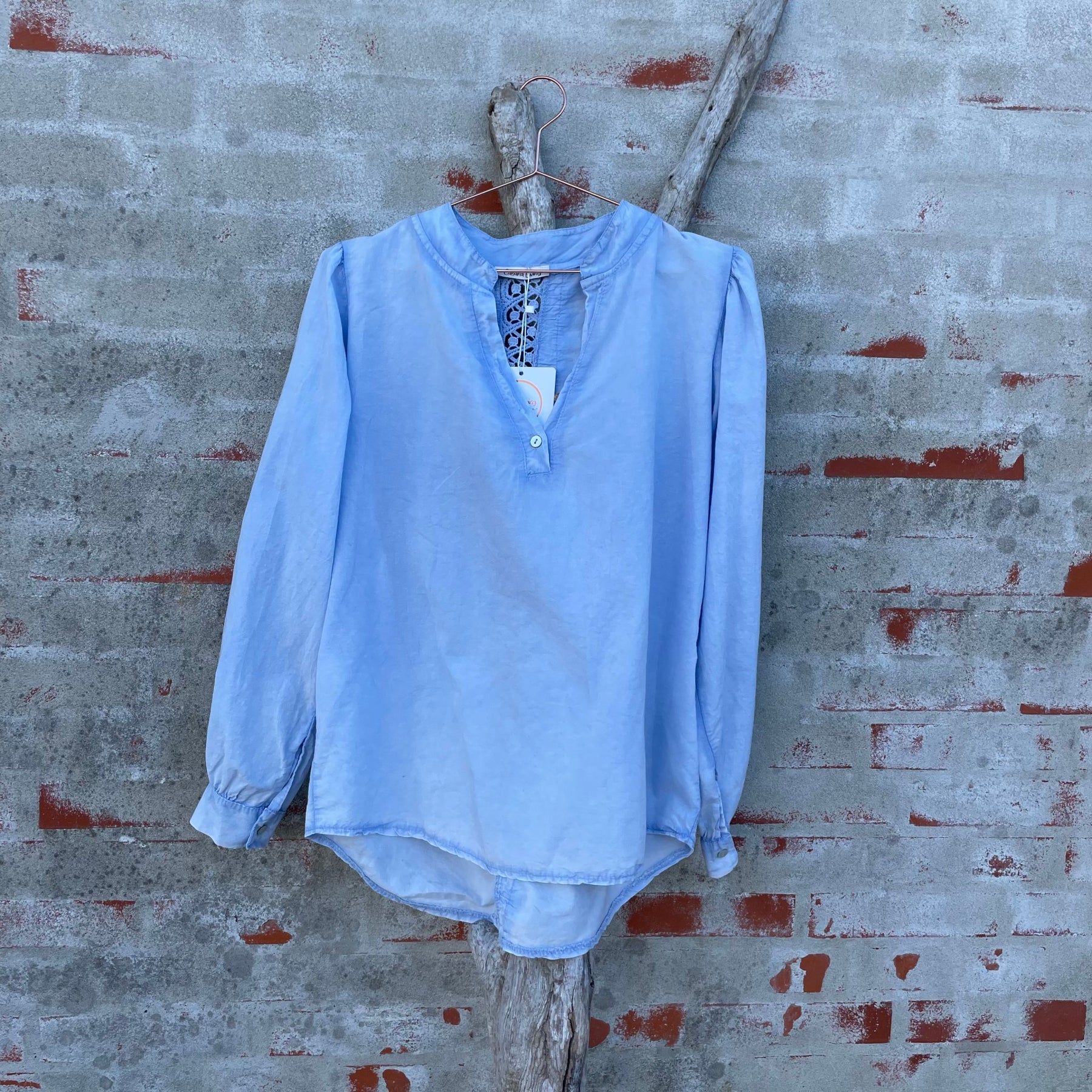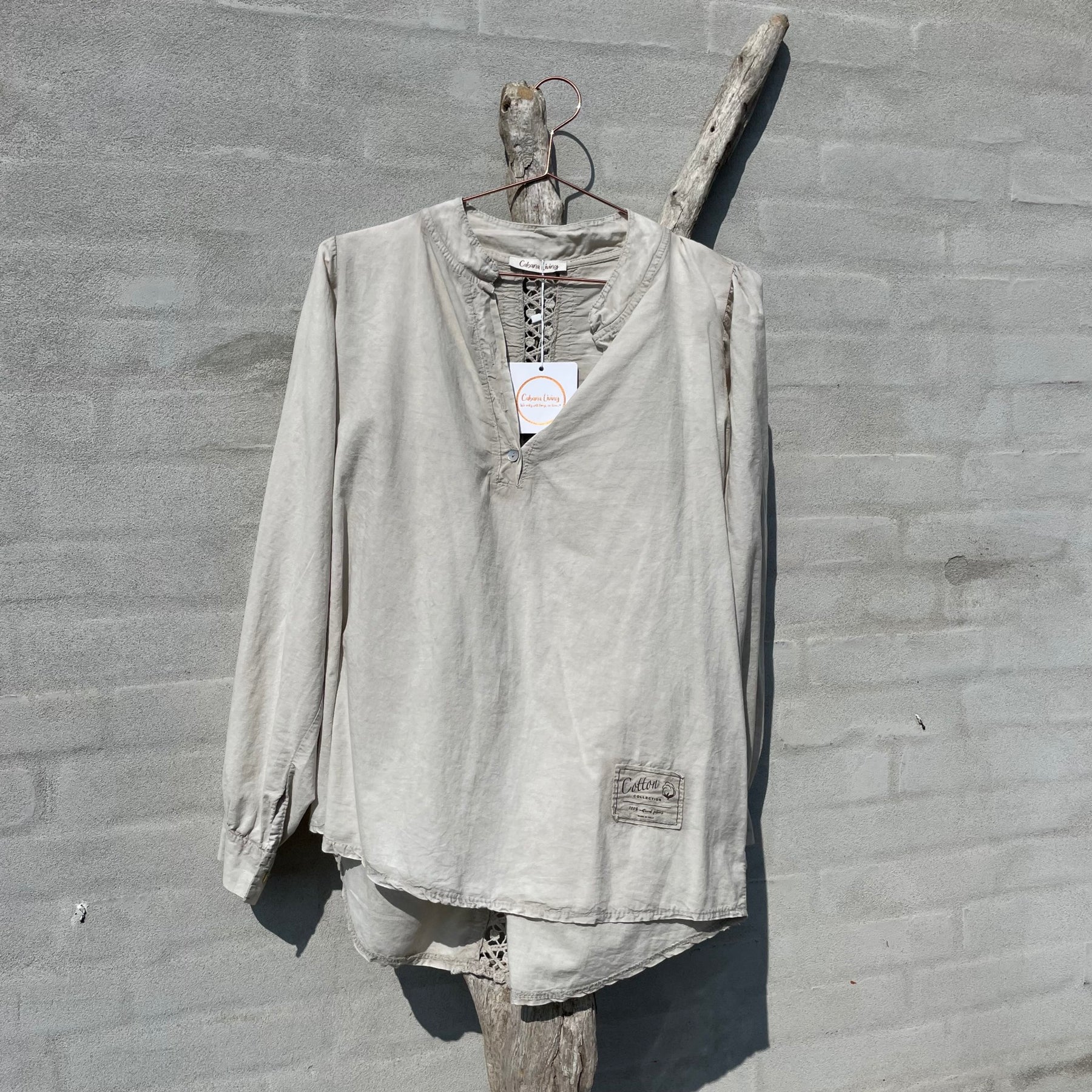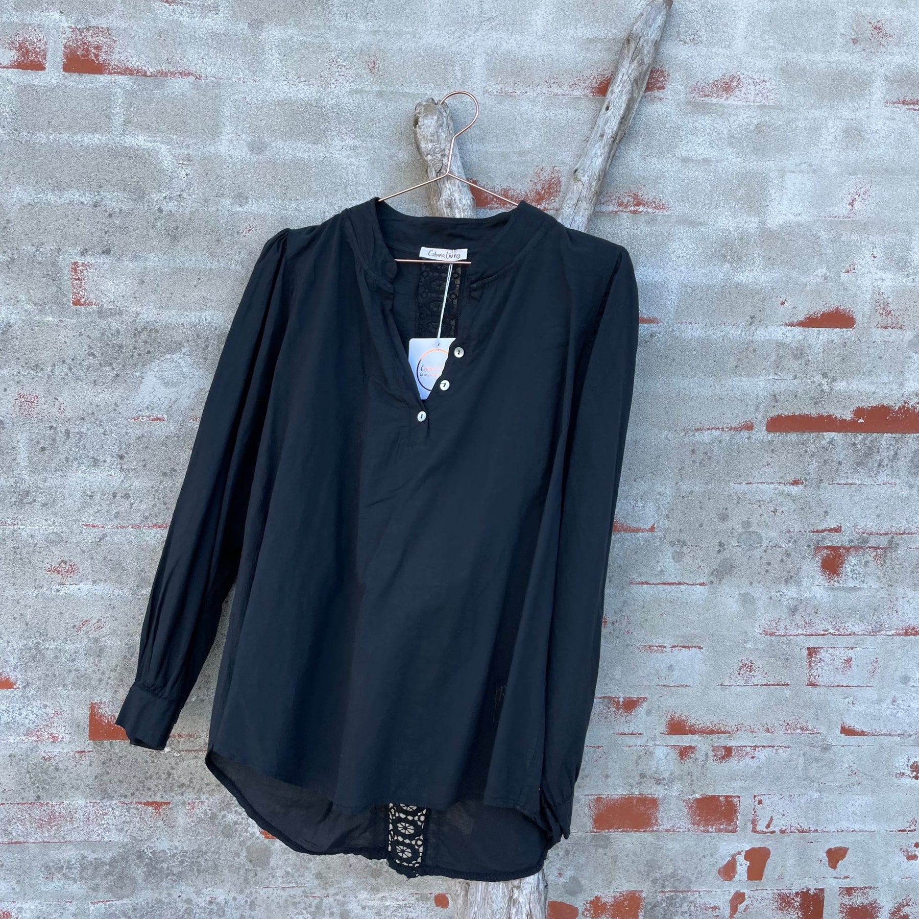 Lækker let bomuldsbluse med kinakrave og blonde indsats i ryggen.