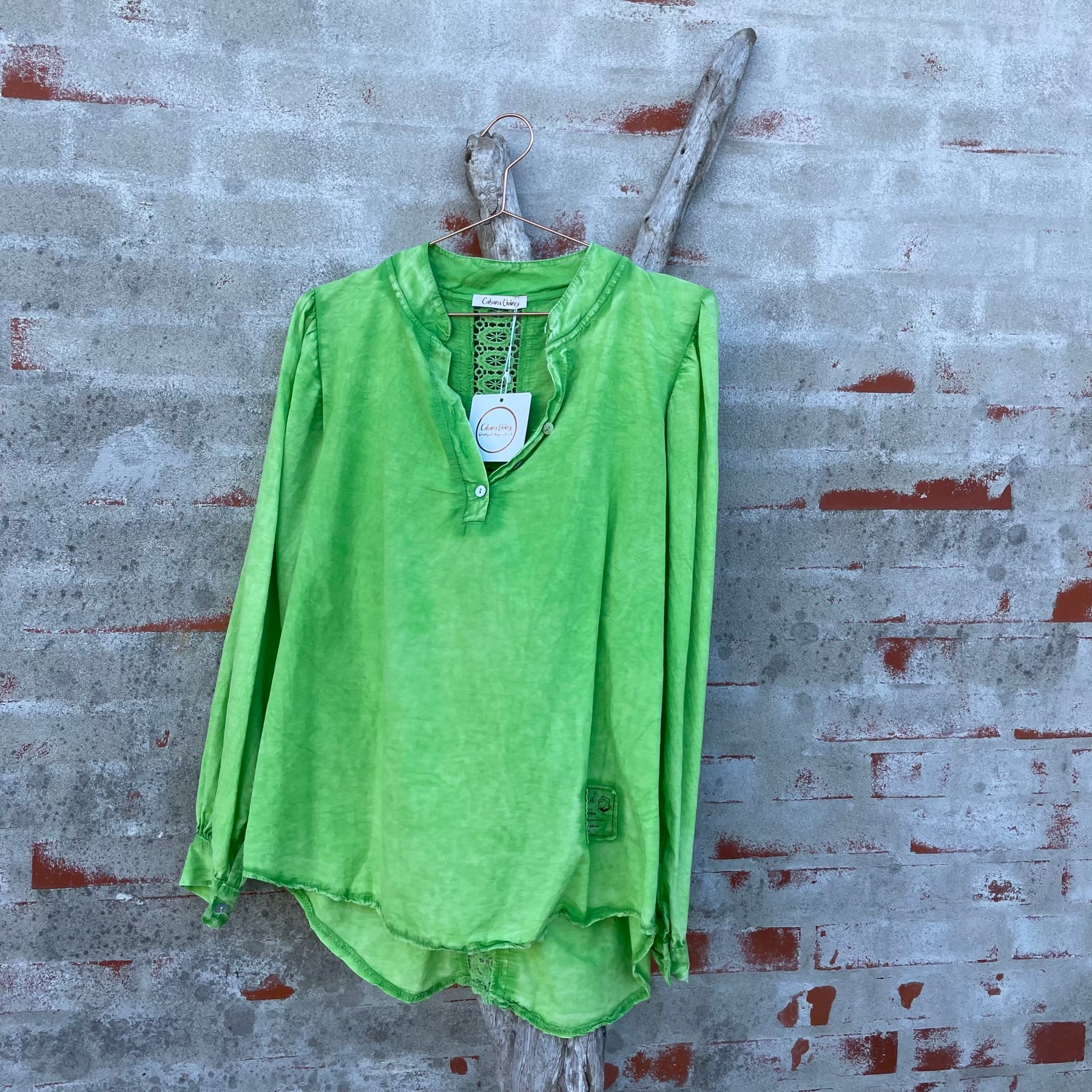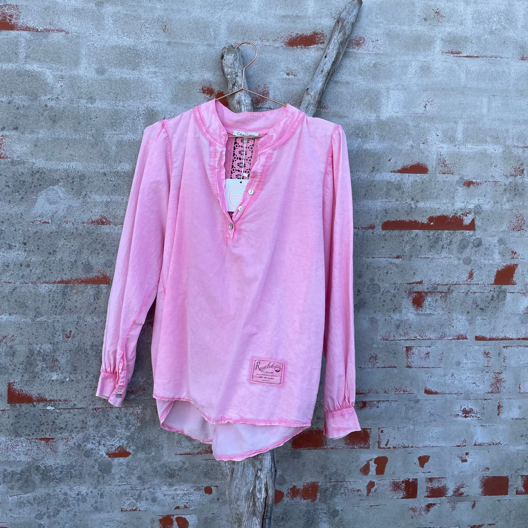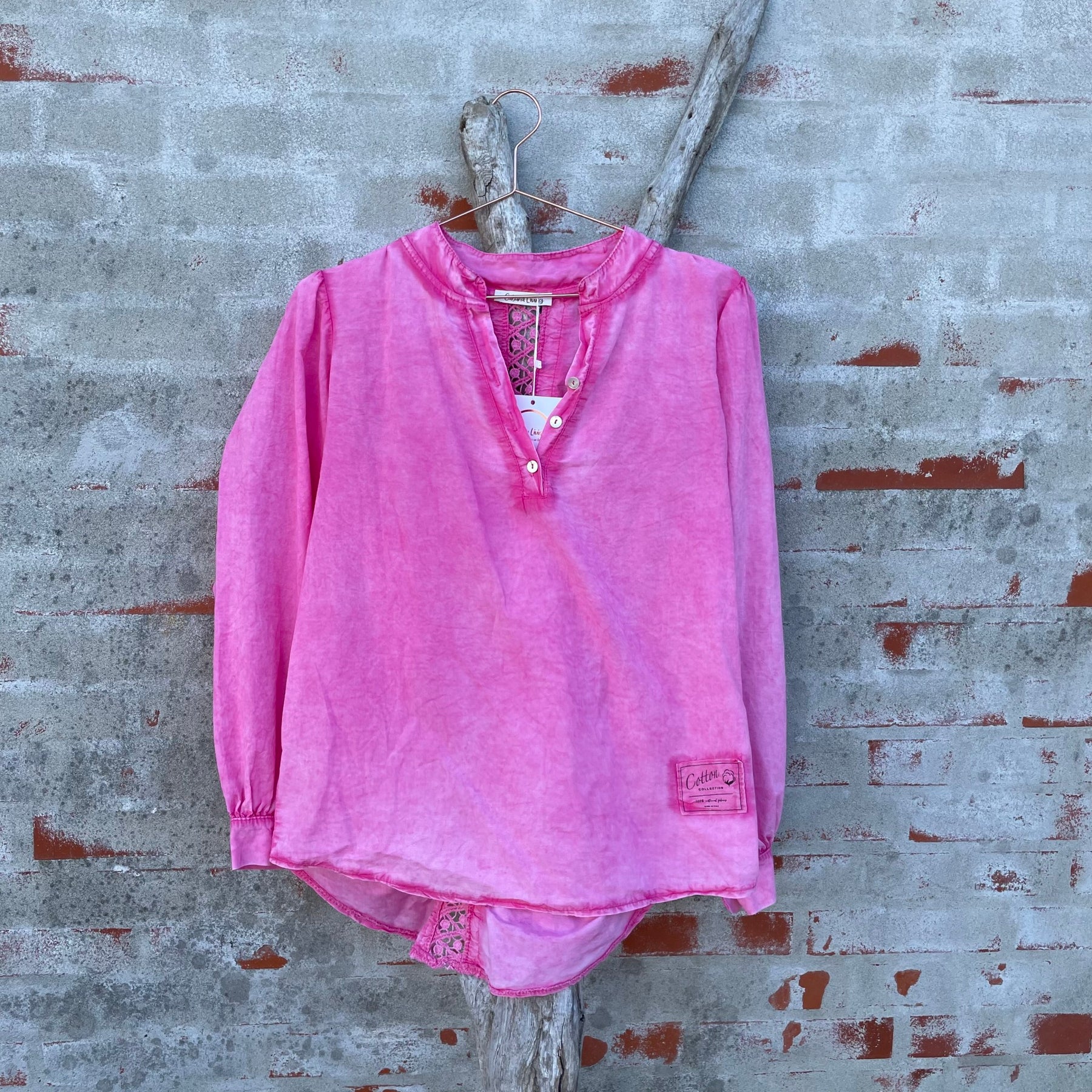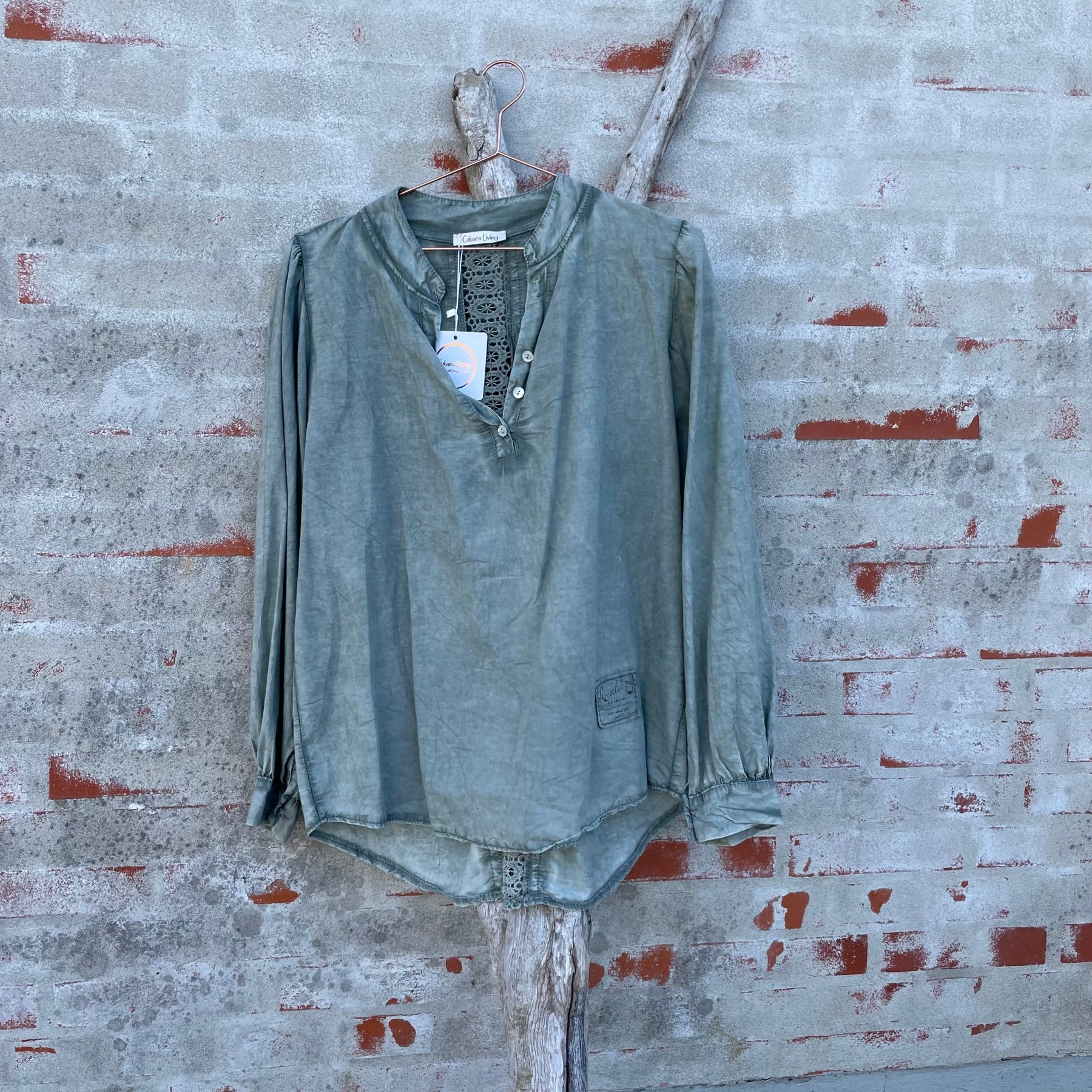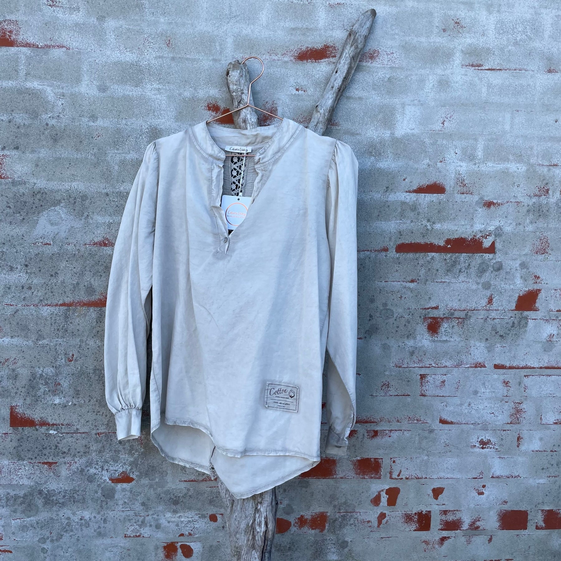 Lækker let bomuldsbluse med kinakrave og blonde indsats i ryggen.