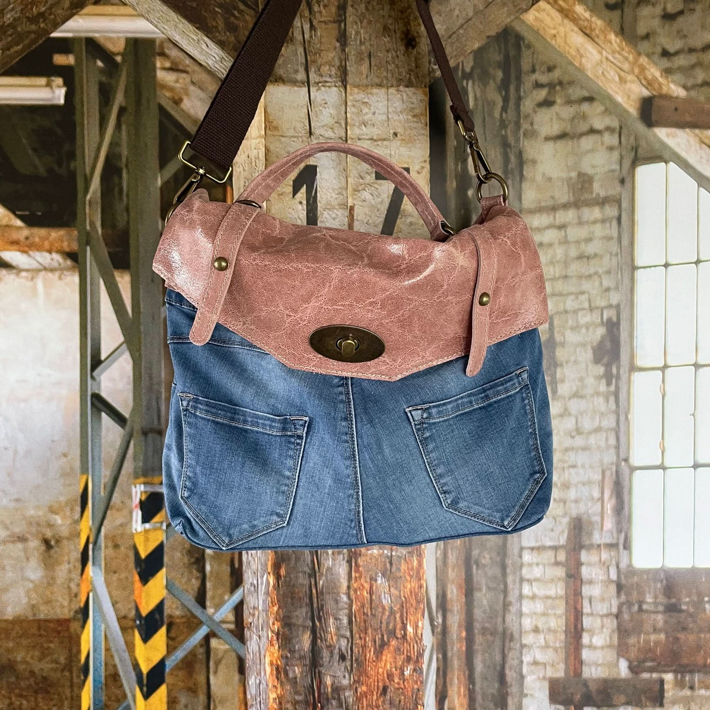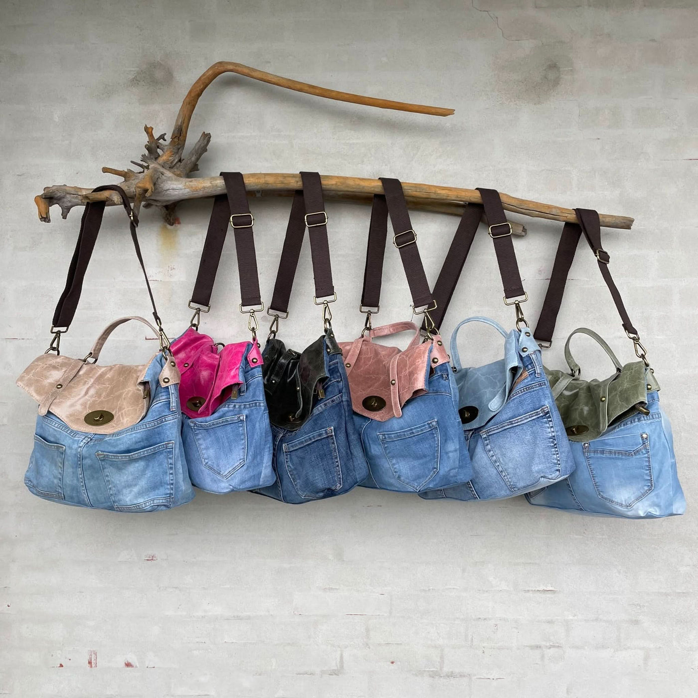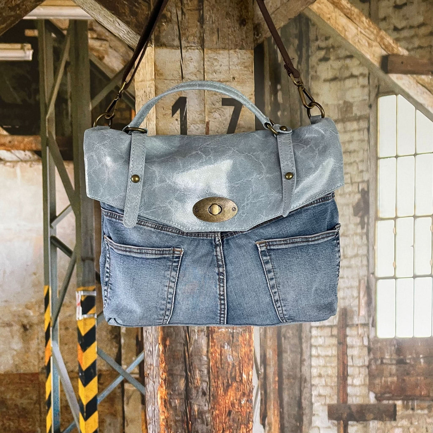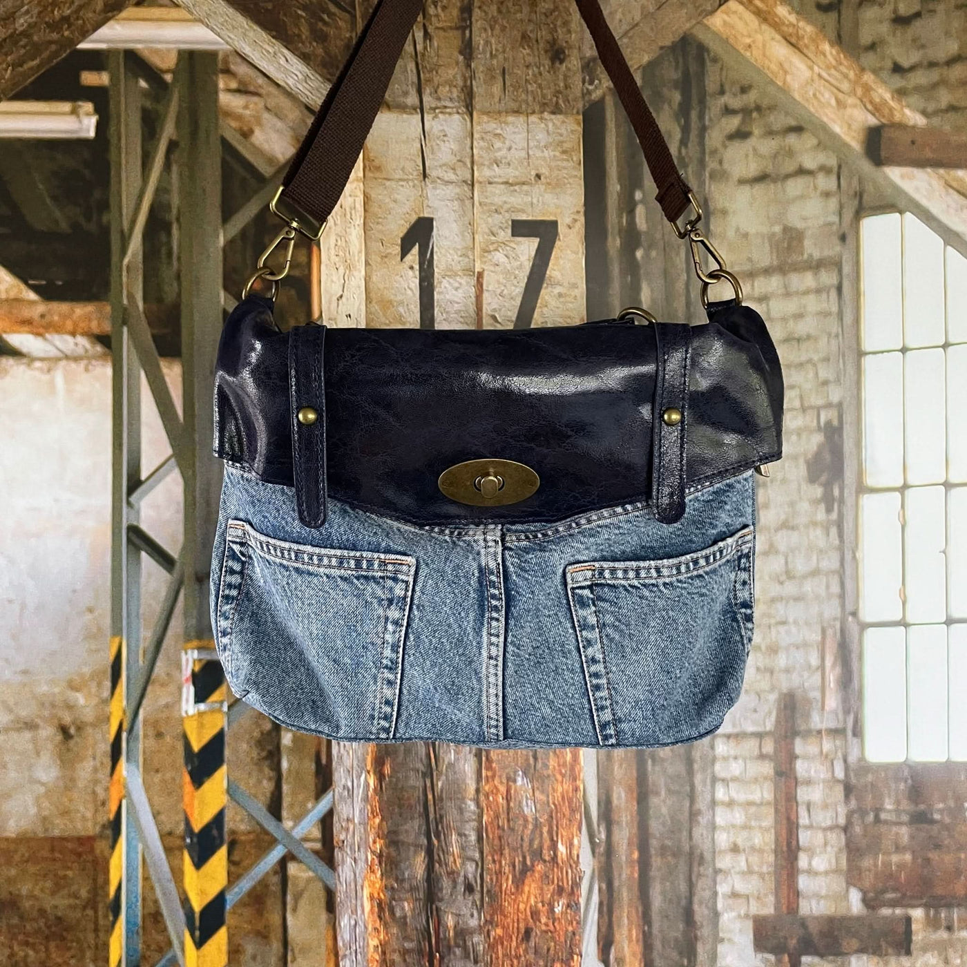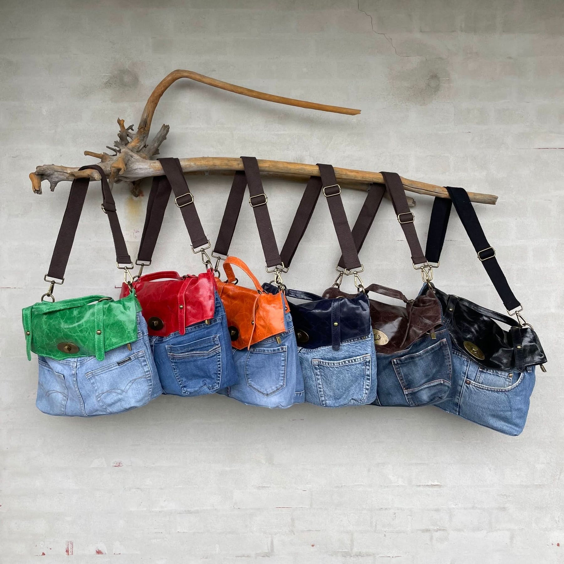 Lækker unika jeans taske ægte læder, farvet i flotte farver. Smart lukkefunktion som gør dig mere sikker mod tyveri fra tasken. Indvendigt for af nylon med en lille lomme med lynlås. Stor lomme med lynlås på bagsiden af tasken.