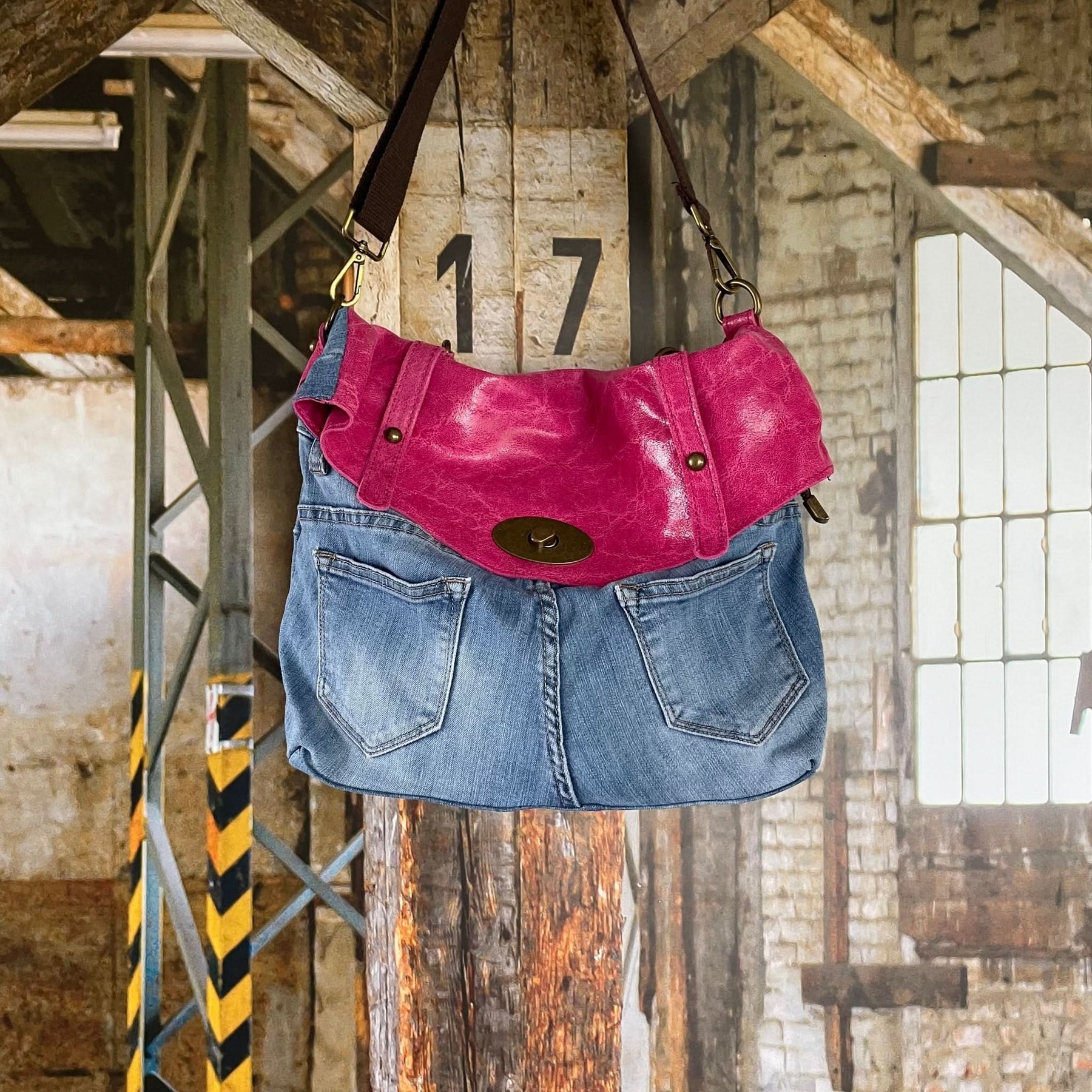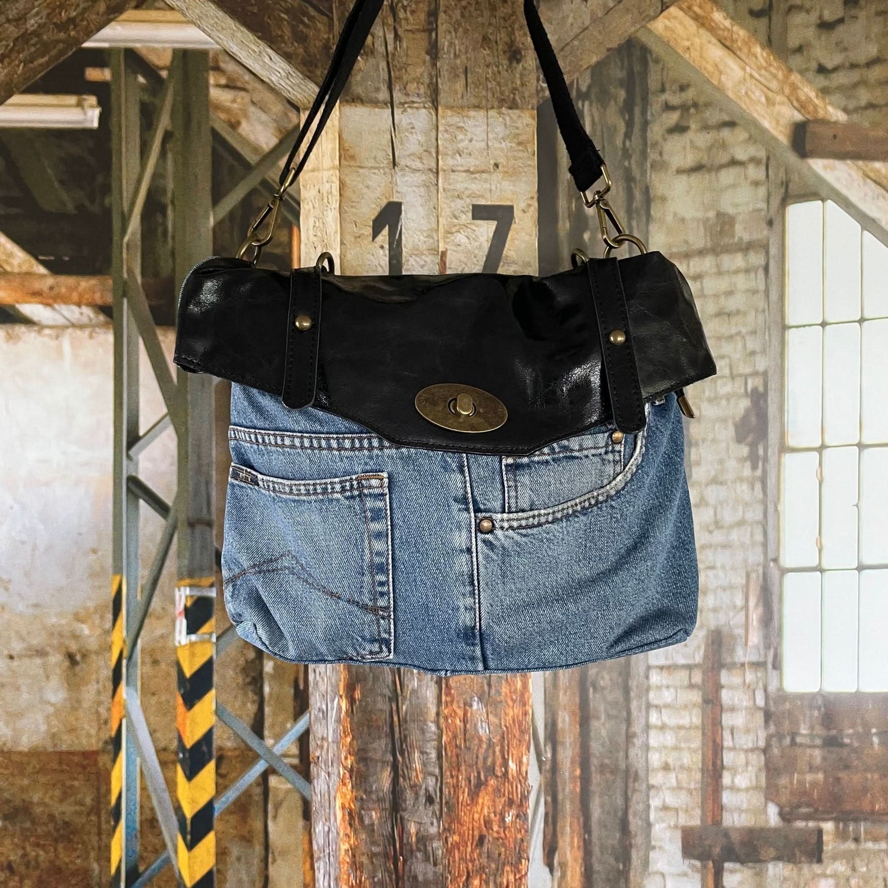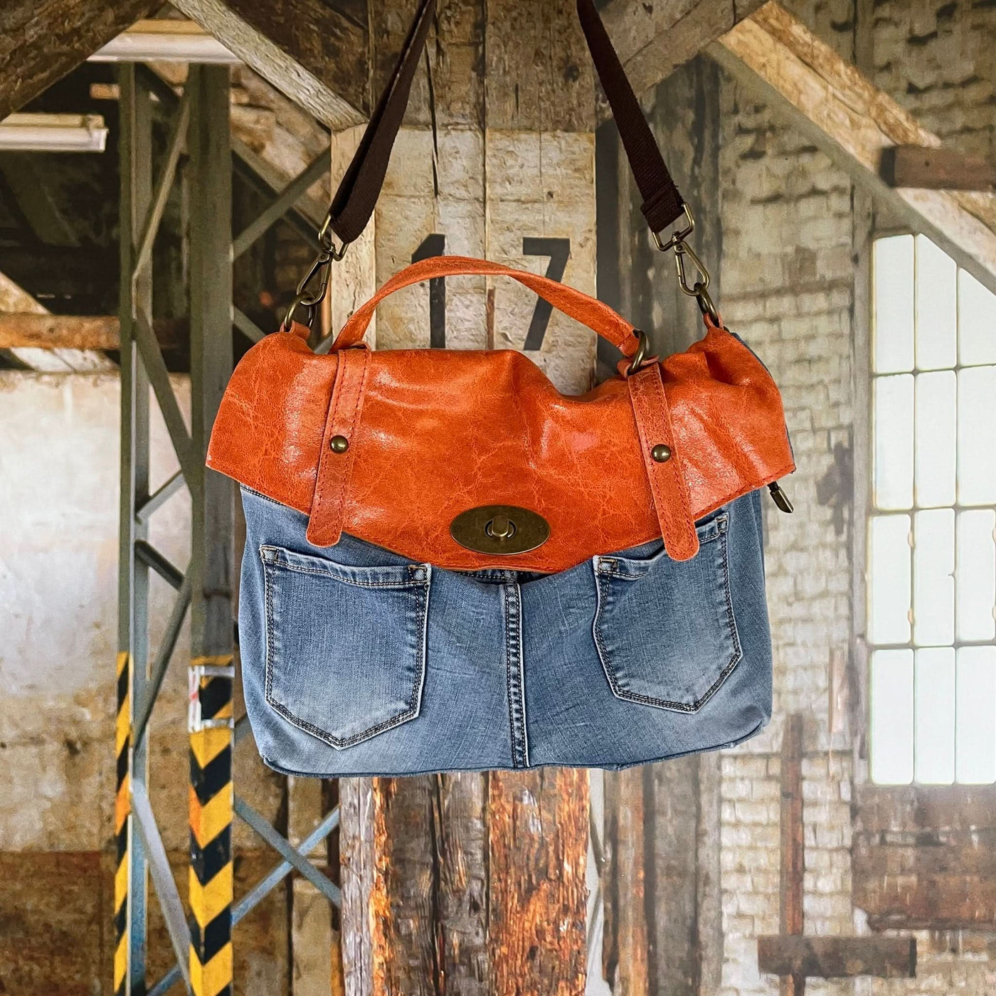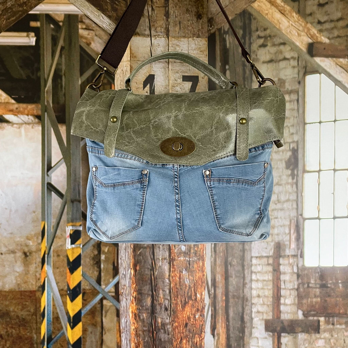 Lækker unika jeans taske ægte læder, farvet i flotte farver. Smart lukkefunktion som gør dig mere sikker mod tyveri fra tasken. Indvendigt for af nylon med en lille lomme med lynlås. Stor lomme med lynlås på bagsiden af tasken.