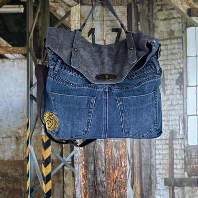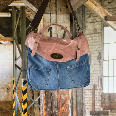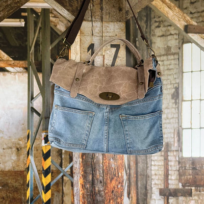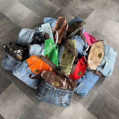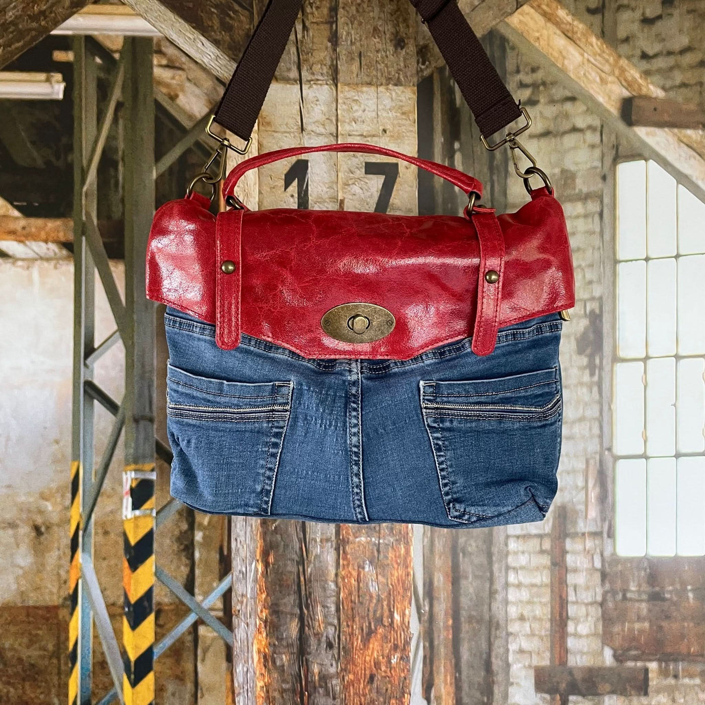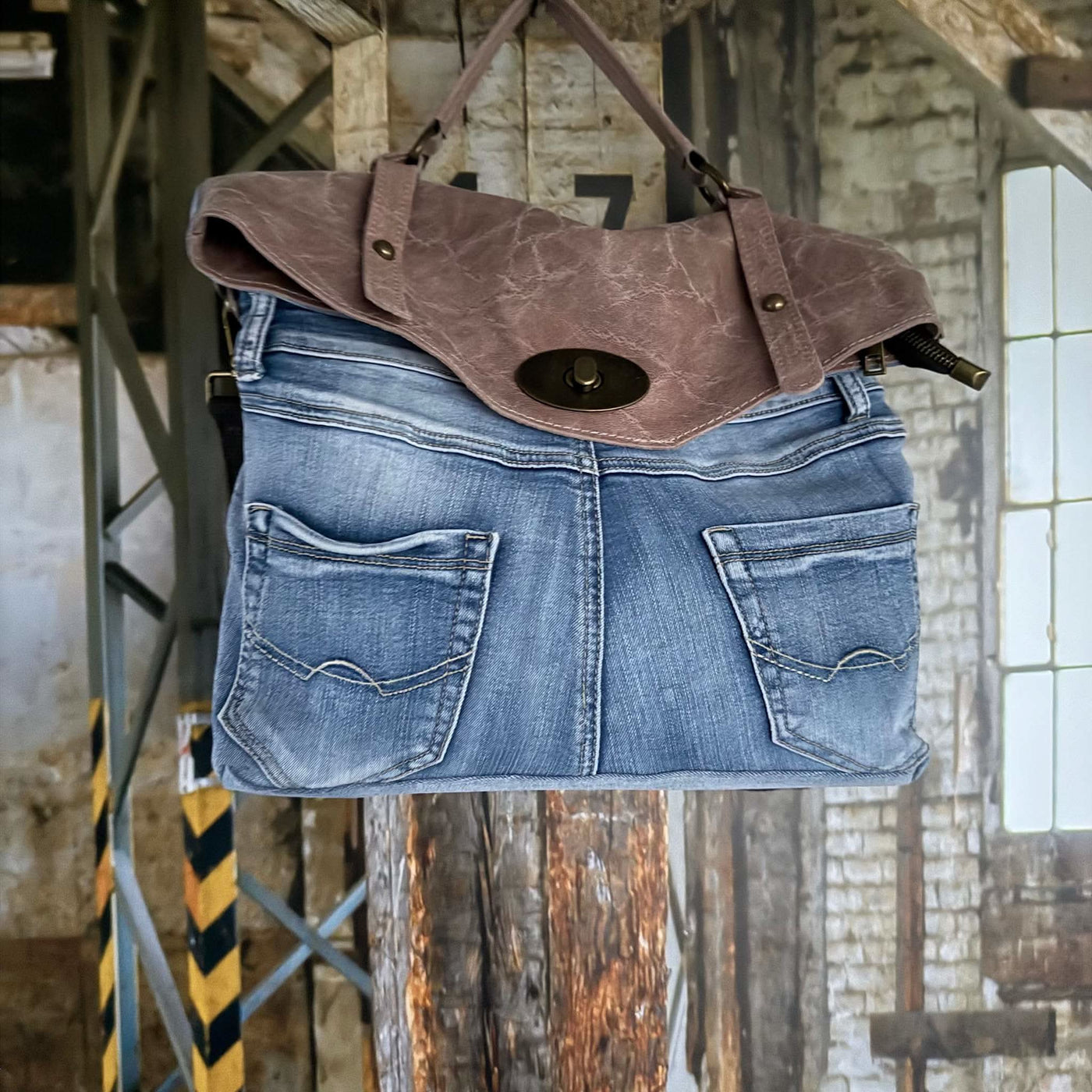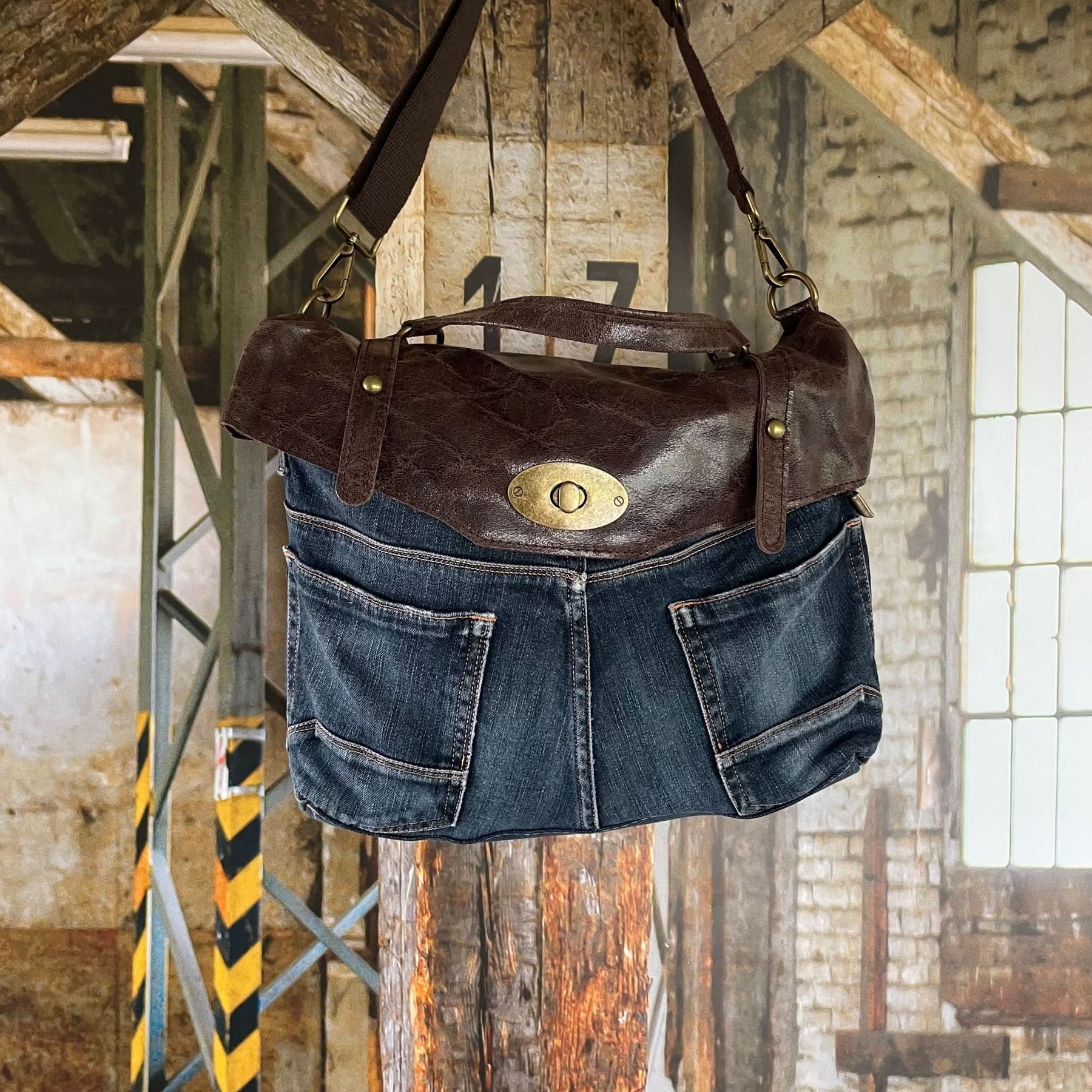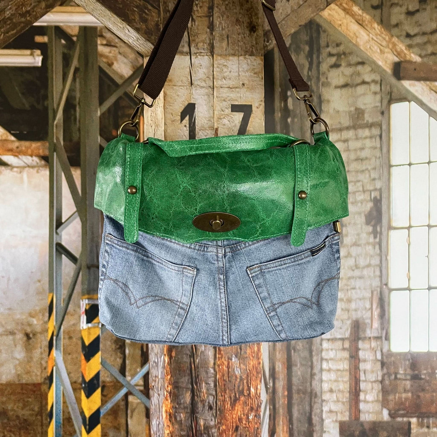 Lækker unika jeans taske ægte læder, farvet i flotte farver. Smart lukkefunktion som gør dig mere sikker mod tyveri fra tasken. Indvendigt for af nylon med en lille lomme med lynlås. Stor lomme med lynlås på bagsiden af tasken.