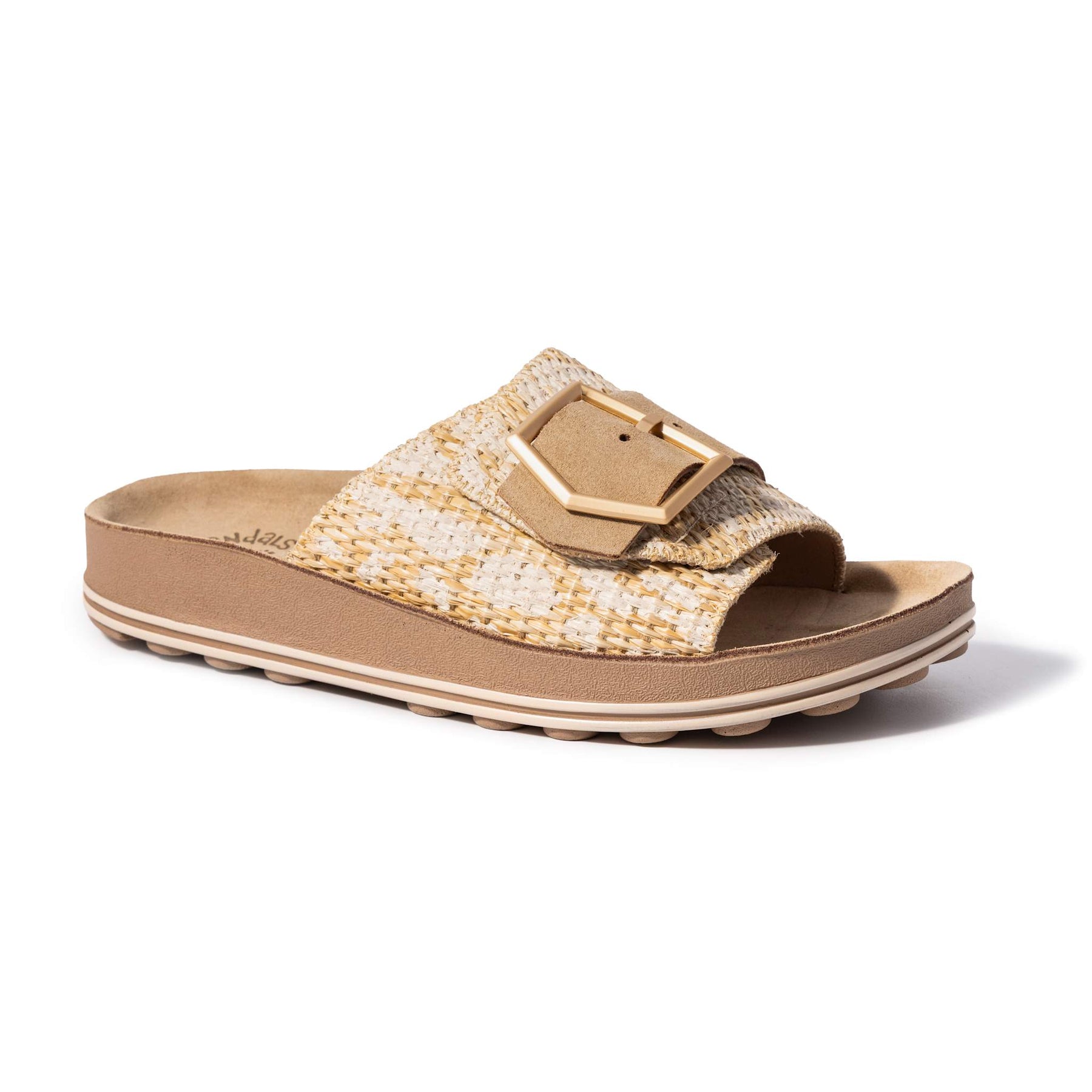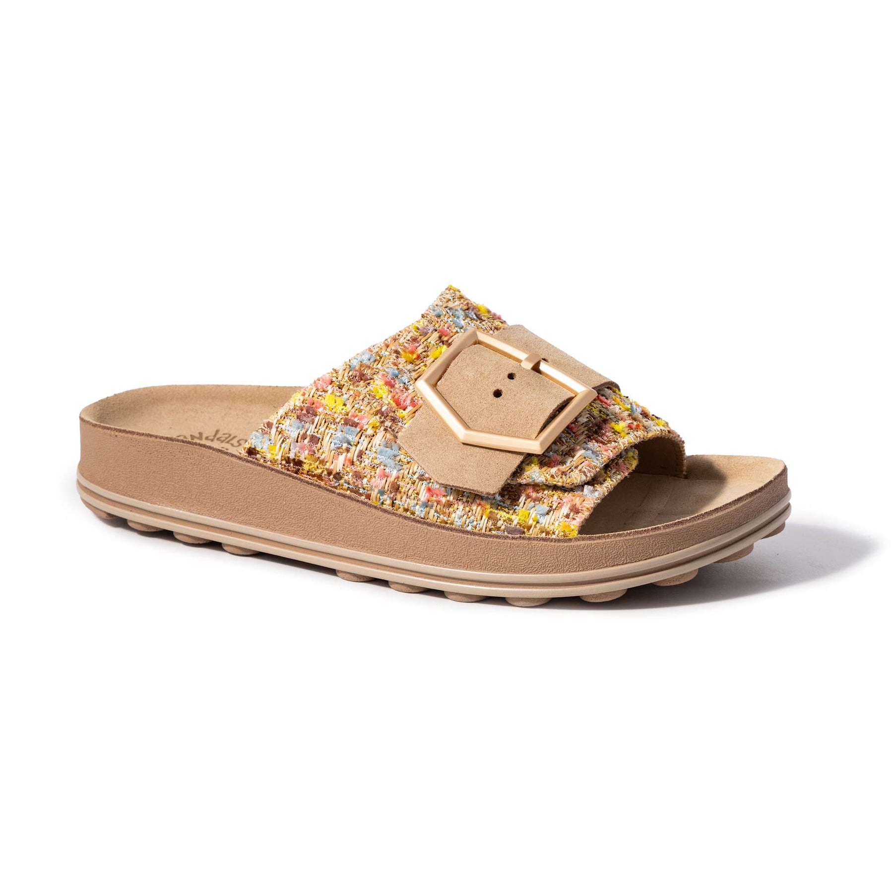 En smart klip klap med et stort spænde, sandalen kan justeres over foden, da der er et bredt stykke velcro på indersiden af spændet.