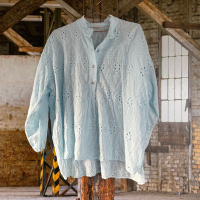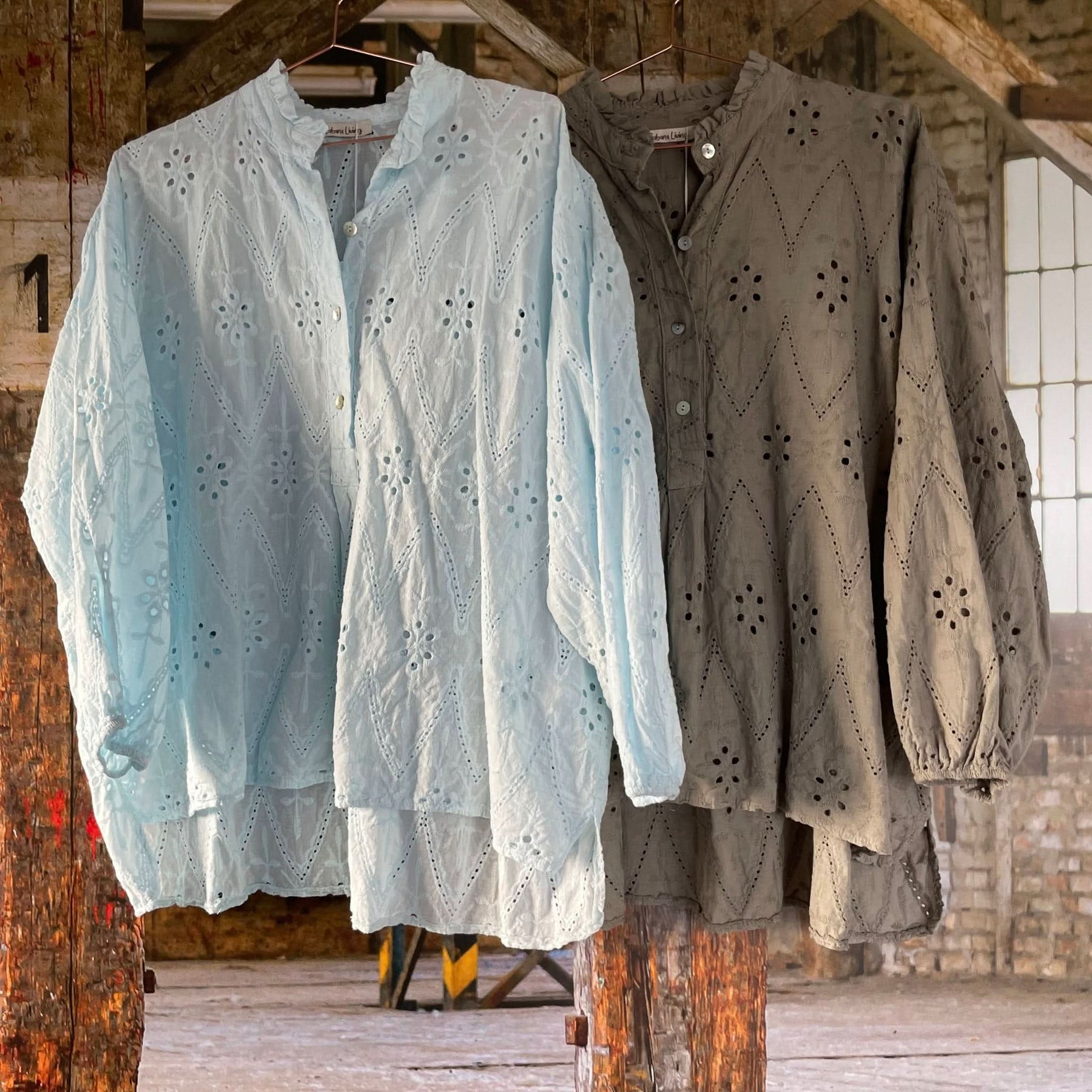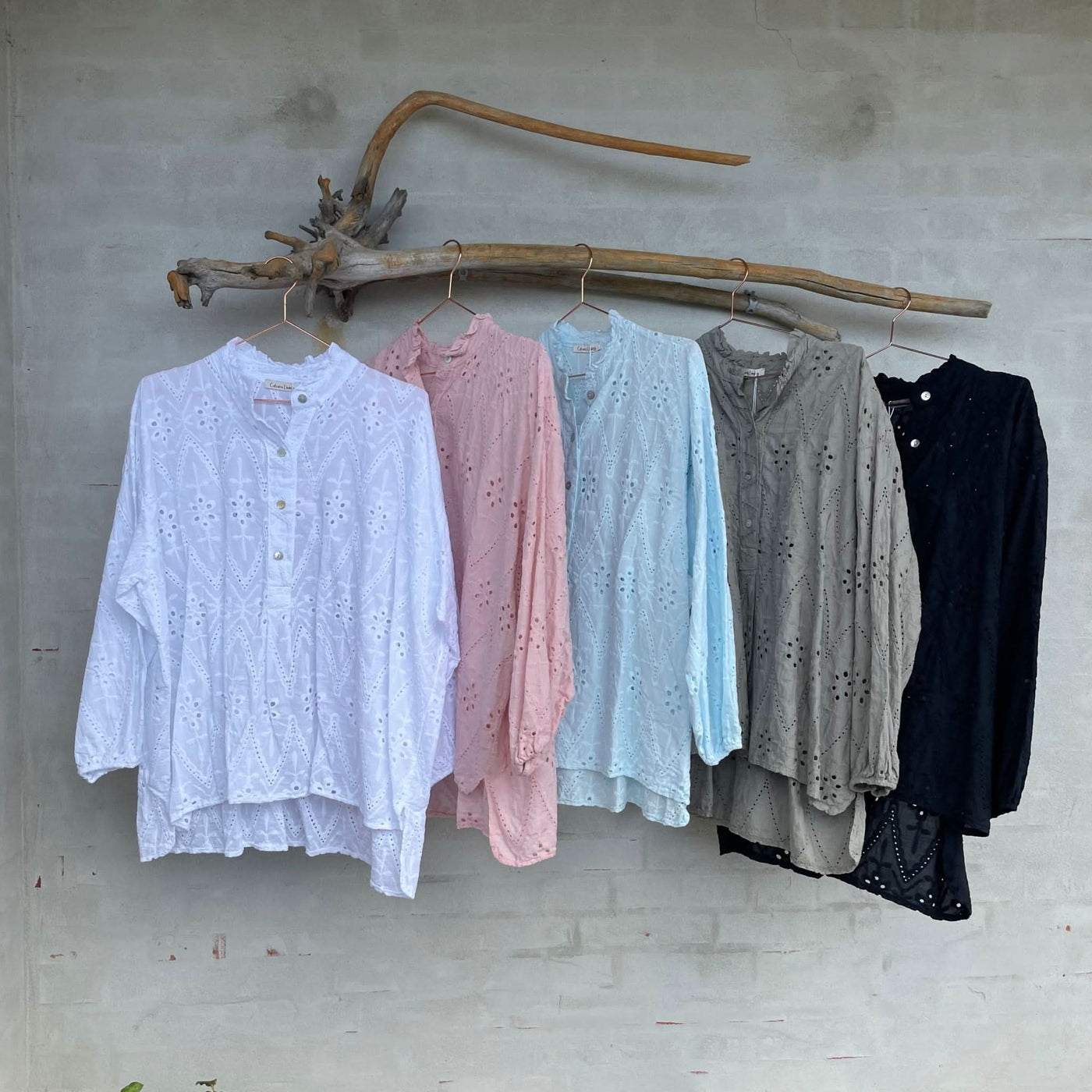 Lækre broderianglaise bluse med høj hals og elastik effekt i ærme.