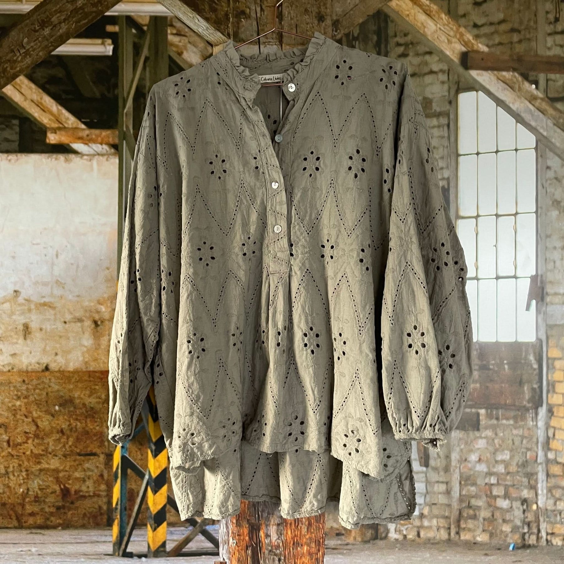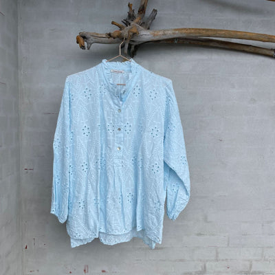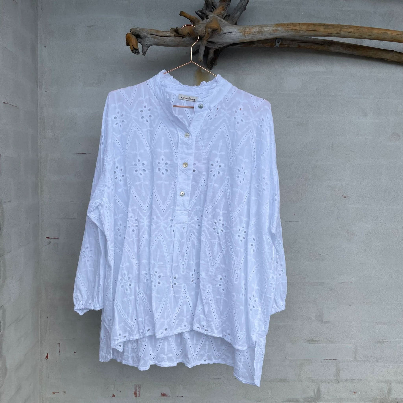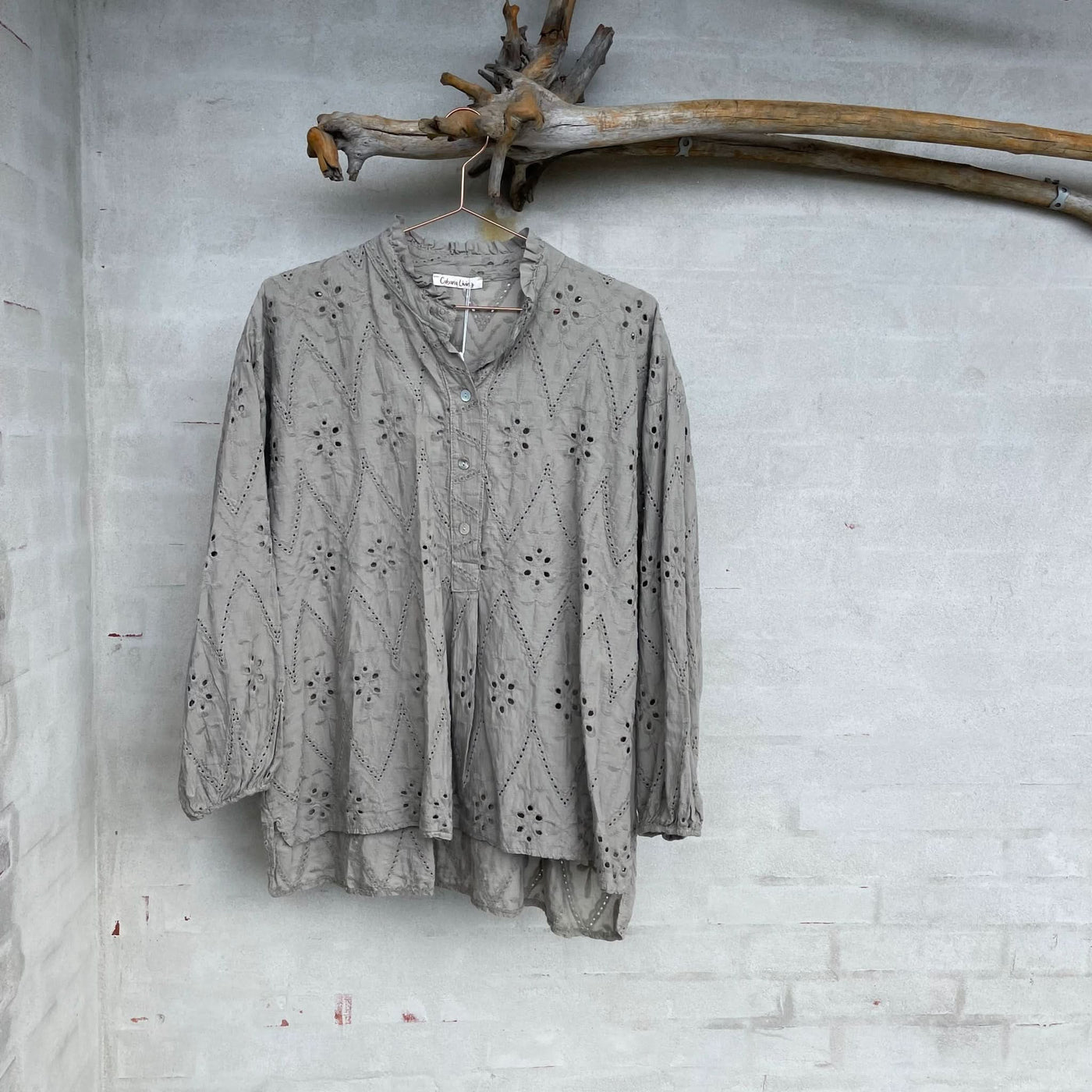 Lækre broderianglaise bluse med høj hals og elastik effekt i ærme.