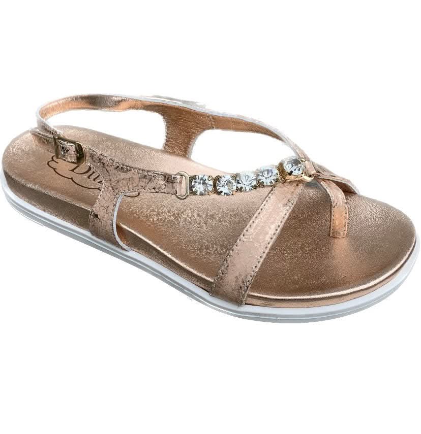 En smart sandal i cobber med tåsplit og lukkes med en remme ved anklen