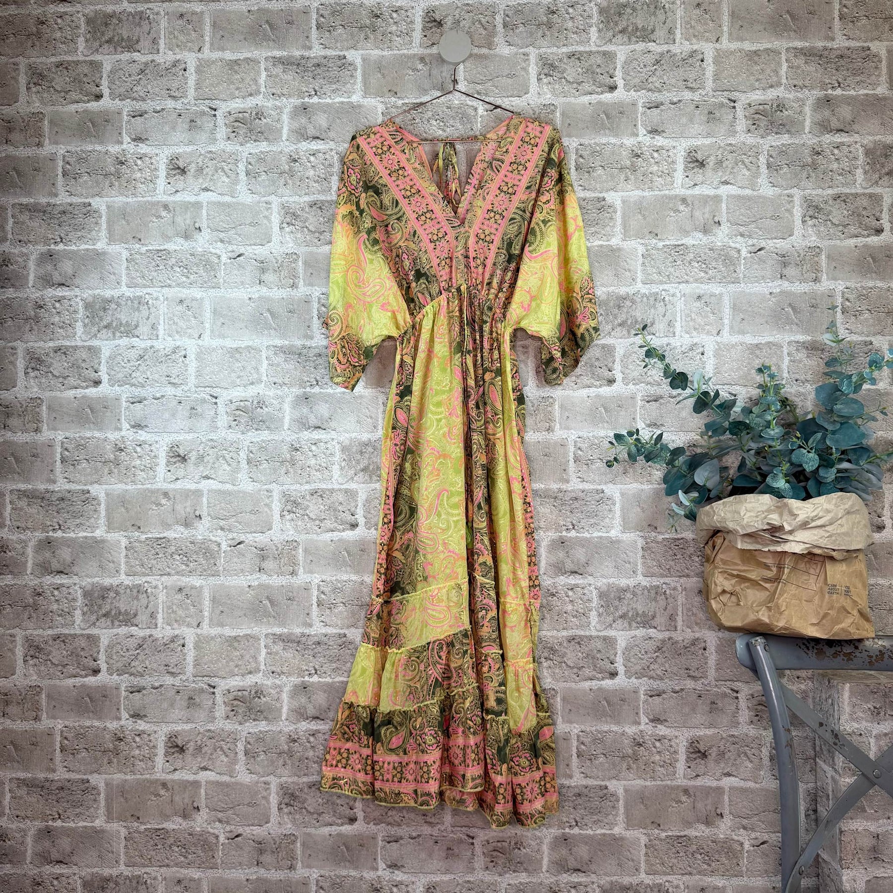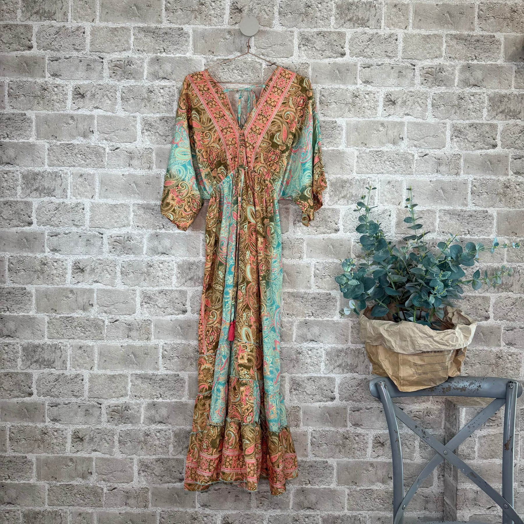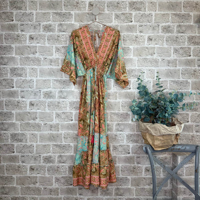 ❥ Mål på størrelse: Onesize - Mål over bryst: 34 cm - Mål over bryst udstrakt: 57 cm - Mål i bund: 150 cm - Længde front: 140 cm - Længde Bag: 140 cm - Ærme udvendig: 47 cm - Ærme indvendig: 18 cm